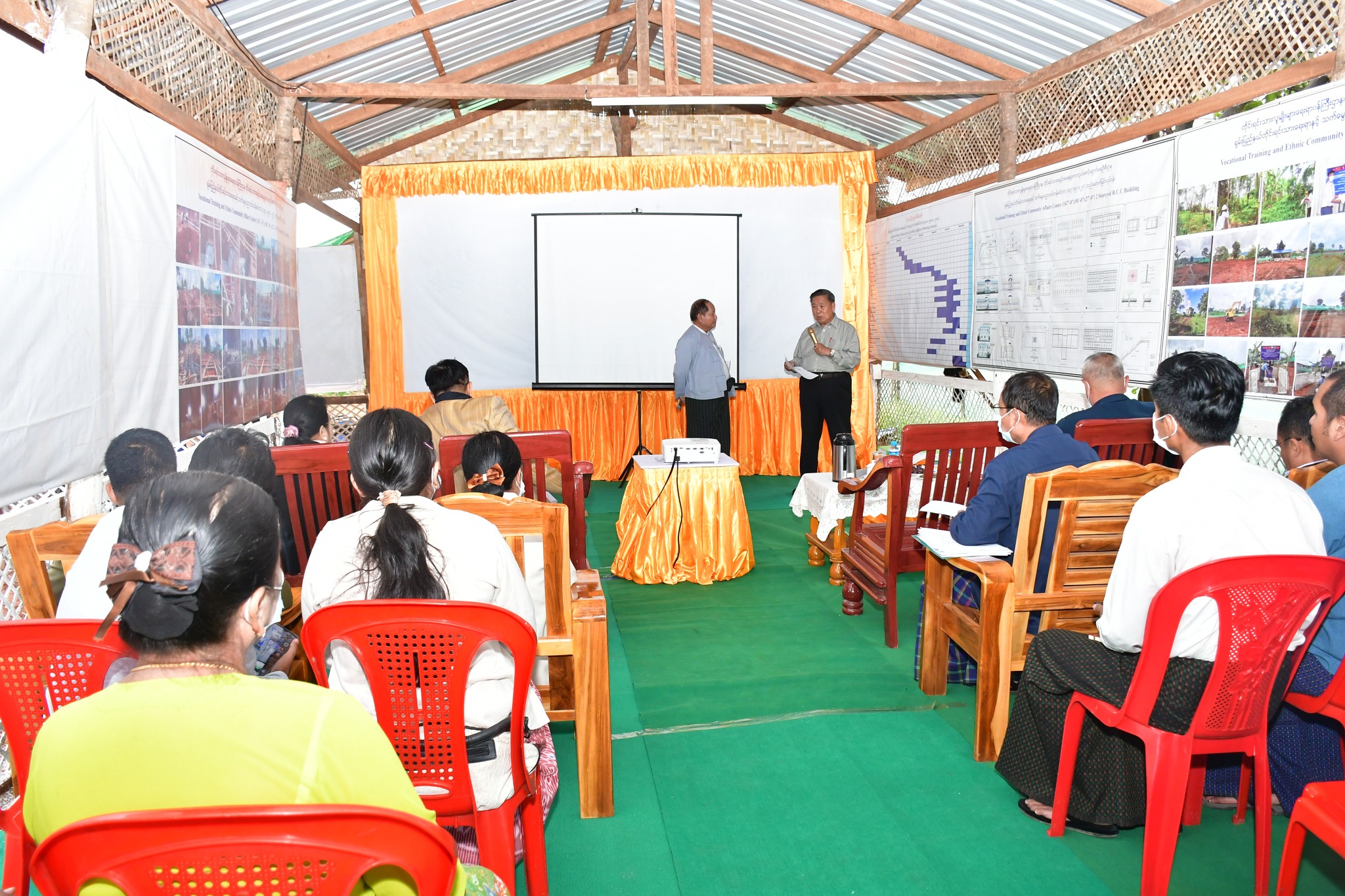 ပမထဦးစွာ ရှင်းလင်းဆောင်၌ ရှမ်းပြည်နယ် တိုင်းရင်းသားရေးရာနှင့်သက်မွေးပညာ သင်တန်းစင်တာအဆောက်အအုံကို တာဝန်ယူတည်ဆောက်လျက်ရှိသည့် မိုးယံဝင့်ချီ ကုမ္ပဏီလိမိတက်မှ တာဝန်ရှိသူတစ်ဦးက လုပ်ငန်းဆောင်ရွက်ပြီးစီးမှုအခြေအနေများ၊ ဆက်လက်ဆောင်ရွက်မည့် လုပ်ငန်းများနှင့်ပတ်သက်ပြီး ရှင်းလင်းတင်ပြခဲ့ပါသည်။ ရှင်းလင်းတင်ပြချက်များအပေါ် ပြည်ထောင်စုဝန်ကြီးက ရှမ်းပြည်နယ်သည် အေးချမ်းသည့် အတွက် ဤအဆောက်အအုံကို ပထမဦးဆုံး အကောင်အထည်ဖော်တည်ဆောက်ရခြင်း ဖြစ်ပါကြောင်း၊ သင်တန်းစင်တာသည် ရှမ်းပြည်နယ်ရှိ တိုင်းရင်းသားများ၏ လူမှုဘဝဖွံ့ဖြိုး တိုးတက်ရေးအတွက် ကနဦးအစပြုသည့် အမှတ်အသားတစ်ခုဖြစ်သဖြင့် သတ်မှတ်စံချိန် စံညွှန်းများနှင့်အညီ သတ်မှတ်ကာလအတွင်း အချိန်မီပြီးစီးအောင် တည်ဆောက်သွားရန် မှာကြားလိုပါကြောင်း၊ အဆောက်အအုံကို တာဝန်ယူတည်ဆောက်နေသည့် ကုမ္ပဏီ အနေဖြင့်လည်း အခက်အခဲများရှိပါက သက်ဆိုင်ရာတာဝန်ရှိသူများကို တင်ပြဆွေးနွေး နိုင်ပါကြောင်း လမ်းညွှန်မှာကြားခဲ့ပါသည်။