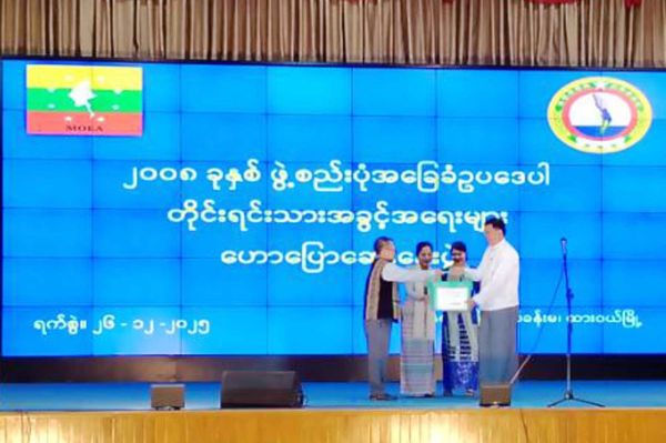 ဆက်လက်၍ အသိပညာပေးဟောပြောသော ဒုတိယဝန်ကြီးနှင့် အကြံပေးပုဂ္ဂိုလ်အား တိုင်းဒေသကြီး တိုင်းရင်းသားရေးရာဝန်ကြီးက အမှတ်တရလက်ဆောင်ပစ္စည်းပေးအပ်ပြီး ကျေးဇူးတင်စကား ပြန်လည်ပြောကြားသည်။