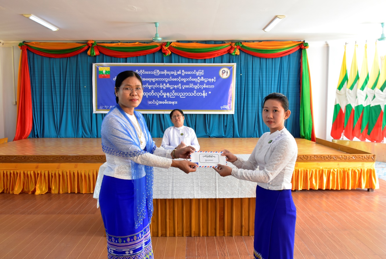 ဆက်လက်၍ တိုင်းရင်းသားရေးရာဝန်ကြီး ဦးစောလင်းခယ်က သင်တန်းတွင် ထူးချွန်ဆုရရှိသူ သင်တန်းသူများအား ဆုချီးမြှင့်ခြင်း၊ တိုင်းဒေသကြီးအသေးစားစက်မှုလက်မှုလုပ်ငန်းဦးစီးဌာန၊ ဒုတိယတိုင်းဦးစီးမှူး ဒေါ်မဉ္ဇူဝင်းက သင်တန်းဆင်းလက်မှတ်များပေးအပ်ခြင်းနှင့် တိုင်းရင်းသားအခွင့်အရေးများကာကွယ်စောင့်ရှောက်ရေးဦးစီးဌာန၊ ဧရာဝတီတိုင်းဒေသကြီး ညွှန်ကြားရေးမှူးရုံးမှ ဒုတိယညွှန်ကြားရေးမှူး ဒေါ်စန်းက သင်တန်းနည်းပြဆရာမများအား ဂုဏ်ပြုချီးမြှင့်ငွေနှင့် သင်တန်းသား၊ သင်တန်းသူများအား လူသုံးကုန်ပစ္စည်းများထောက်ပံ့ပေးအပ်ခြင်း အစီအစဉ်တို့ကို ဆောင်ရွက်ခဲ့ပါသည်။ ထို့နောက် သင်တန်းသူတစ်ဦးက ကျေးဇူး တင်စကားပြောကြားခဲ့ပြီး စုပေါင်းမှတ်တမ်းတင် ဓါတ်ပုံရိုက်ကူးကာ အခမ်းအနားကို ရုတ်သိမ်း ခဲ့ပါသည်။