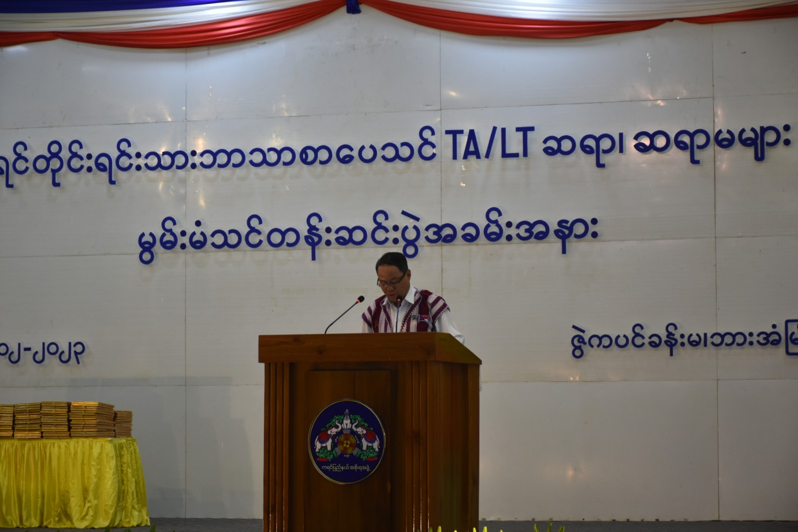 အခမ်းအနားတွင် ကရင်ပြည်နယ်ဝန်ကြီးချုပ် ဦးစောမြင့်ဦးက ကရင်တိုင်းရင်းသားဘာသာ စာပေသင်(TA/LT) မွမ်းမံသင်တန်းသို့ တက်ရောက်လာသည့် ဆရာ၊ ဆရာမများအား မိမိတို့ရဲ့စာပေ ယဉ်ကျေးမှုဓလေ့ထုံးတမ်းများ တန်ဖိုးထားတတ်စေရန်၊ နယ်မြေဒေသအသီးသီးတွင် ကရင်စာပေနှင့် ယဉ်ကျေးမှုရေရှည်ဖွံ့ဖြိုးတိုးတက်စေရန်အတွက် မျိုးဆက်သစ် ကရင်တိုင်းရင်းသားကလေးငယ်များ အား မိမိတို့စာပေ၊ ဘာသာစကား၊ ယဉ်ကျေးမှုဓလေ့ထုံးတမ်းများအား ချစ်မြတ်နိုး တန်ဖိုးထား တတ်စေရေး ဆောင်ရွက်ကြစေလိုပါကြောင်း၊ ကရင်တိုင်းရင်းသားစာပေယဉ်ကျေးမှုနဲ့ ပတ်သက်၍ အခြေခံမှစပြီး ထဲထဲဝင်ဝင် ပိုမိုဆောင်ရွက်နိုင်စေရန်၊ အနာဂတ်တွင် အခြေခံပညာကျောင်းများ၌ စာပေနှင့်ယဉ်ကျေးမှုကို သင်ကြားပို့ချပေးနိုင်မည့် ဆရာ၊ ဆရာမများ ပေါ်ထွန်းလာစေရန်၊ အမျိုးသား ရေးလက္ခဏာများ မပျောက်ပျက်စေရေး၊ ထိန်းသိမ်းစောင့်ရှောက်မြှင့်တင်ရန်နှင့် မိမိတို့၏ စာပေ၊ ဘာသာစကား၊ ထွန်းကားပြန့်ပွါးရေးနှင့် ရိုးရာဓလေ့ထုံးတမ်းများ ယဉ်ကျေးမှုအမွေအနှစ်များ ထိန်းသိမ်း မြှင့်တင်ရန် လိုအပ်ပါကြောင်း ပြောကြားခဲ့ပါသည်။
