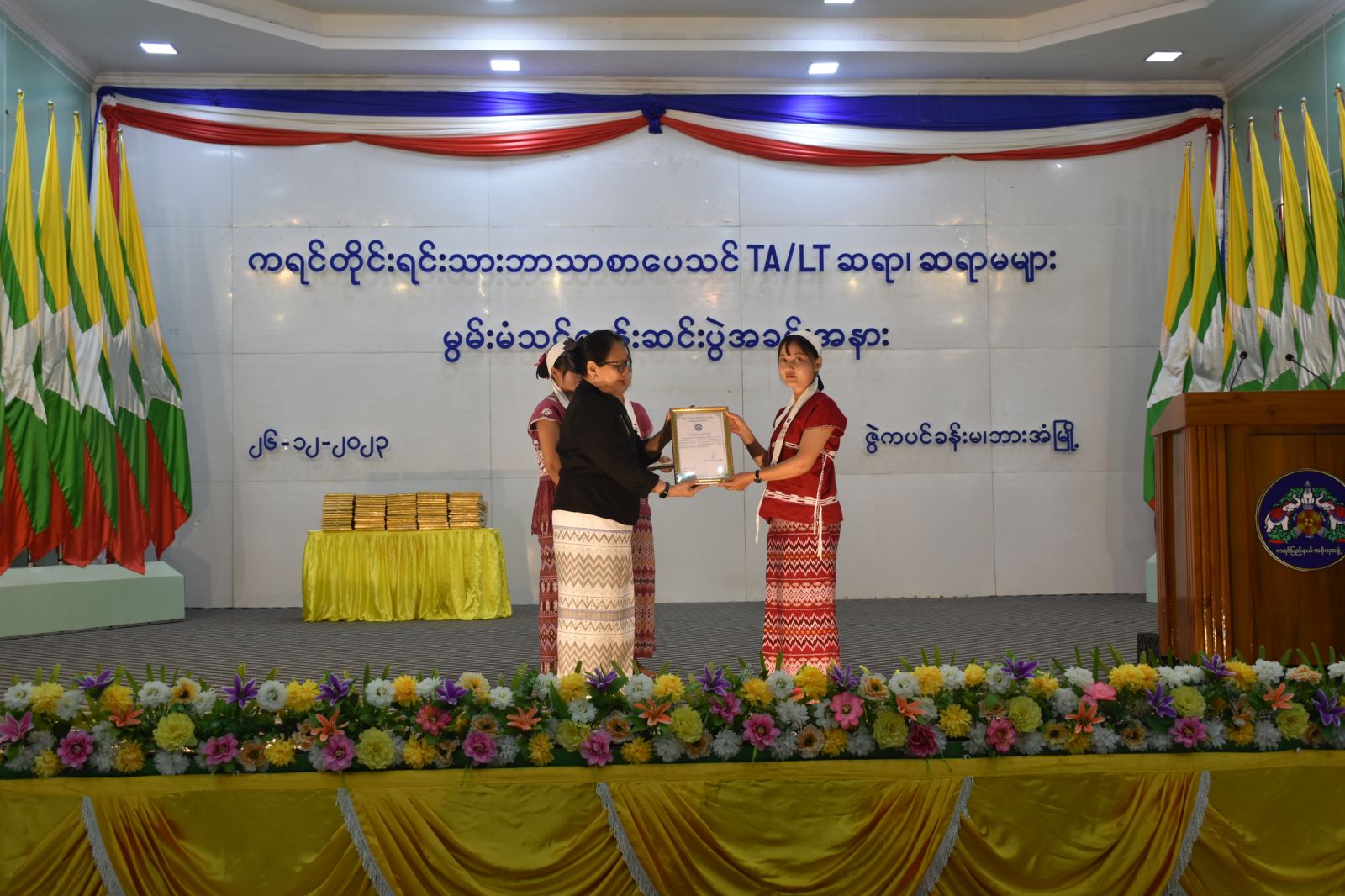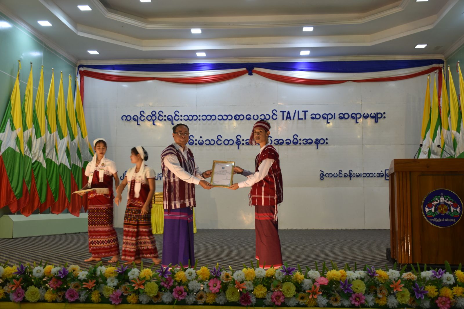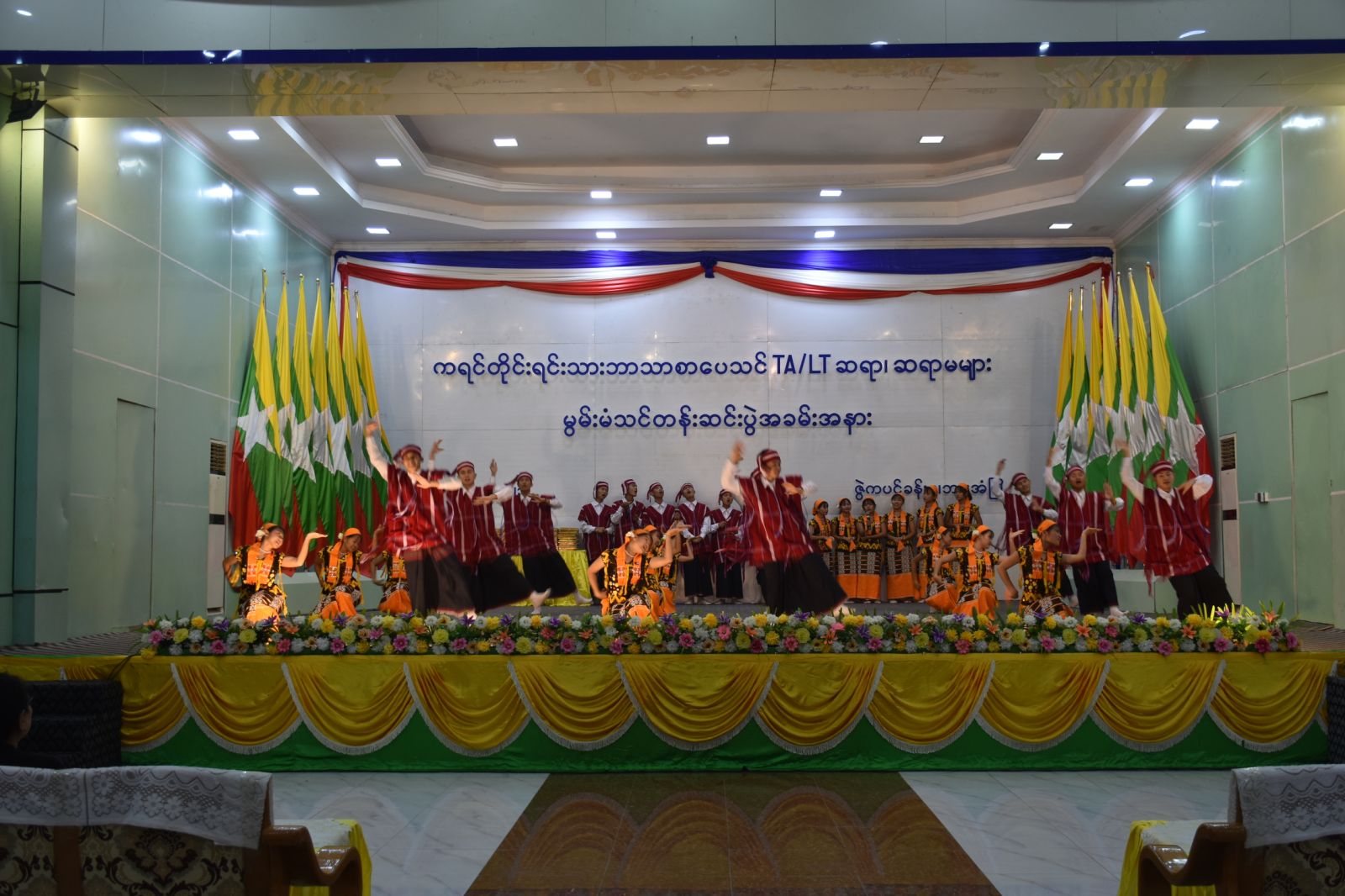 ထို့နောက် ကရင်ရိုးရာဒုံးယိမ်းအကဖြင့် တင်ဆက်ကပြဖျော်ဖြေခဲ့ရာ ပြည်နယ်ဝန်ကြီးချုပ်နှင့် အစိုးရ အဖွဲ့ဝင်ဝန်ကြီးများမှ အသီးသီးဆုများချီးမြှင့်ခဲ့ကြပါသည်။အဆိုပါ သင်တန်းကို ဒီဇင်ဘာလ (၂၂) ရက်နေ့မှ ဒီဇင်ဘာလ(၂၆)ရက်နေ့အထိ ကရင်ပြည်နယ် ဘားအံ၊ လှိုင်းဘွဲ၊ ကော့ကရိတ်၊ ကြာအင်းဆိပ်ကြီး၊ ဖာပွန်မြို့နယ်များမှ ကရင်တိုင်းရင်းသားဘာသာ စာပေသင် TA/LTဆရာ၊ ဆရာမ စုစုပေါင်း (၂၀၀)ဦးကျော် တက်ရောက်ခဲ့ကြောင်း သတင်းရရှိခဲ့ပါသည်။