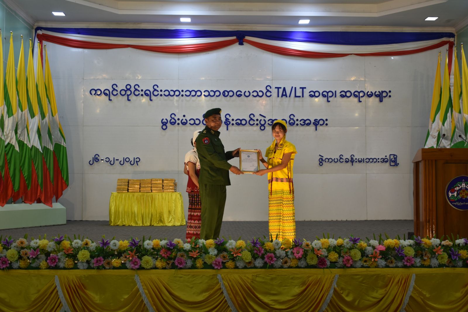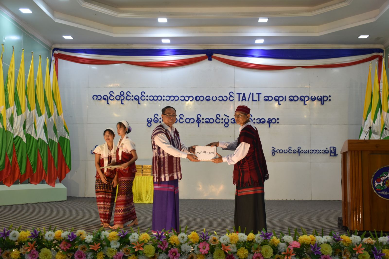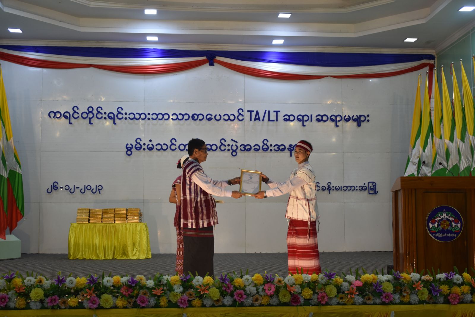 ထို့နောက် ကရင်ရိုးရာဒုံးယိမ်းအကဖြင့် တင်ဆက်ကပြဖျော်ဖြေခဲ့ရာ ပြည်နယ်ဝန်ကြီးချုပ်နှင့် အစိုးရ အဖွဲ့ဝင်ဝန်ကြီးများမှ အသီးသီးဆုများချီးမြှင့်ခဲ့ကြပါသည်။အဆိုပါ သင်တန်းကို ဒီဇင်ဘာလ (၂၂) ရက်နေ့မှ ဒီဇင်ဘာလ(၂၆)ရက်နေ့အထိ ကရင်ပြည်နယ် ဘားအံ၊ လှိုင်းဘွဲ၊ ကော့ကရိတ်၊ ကြာအင်းဆိပ်ကြီး၊ ဖာပွန်မြို့နယ်များမှ ကရင်တိုင်းရင်းသားဘာသာ စာပေသင် TA/LTဆရာ၊ ဆရာမ စုစုပေါင်း (၂၀၀)ဦးကျော် တက်ရောက်ခဲ့ကြောင်း သတင်းရရှိခဲ့ပါသည်။
