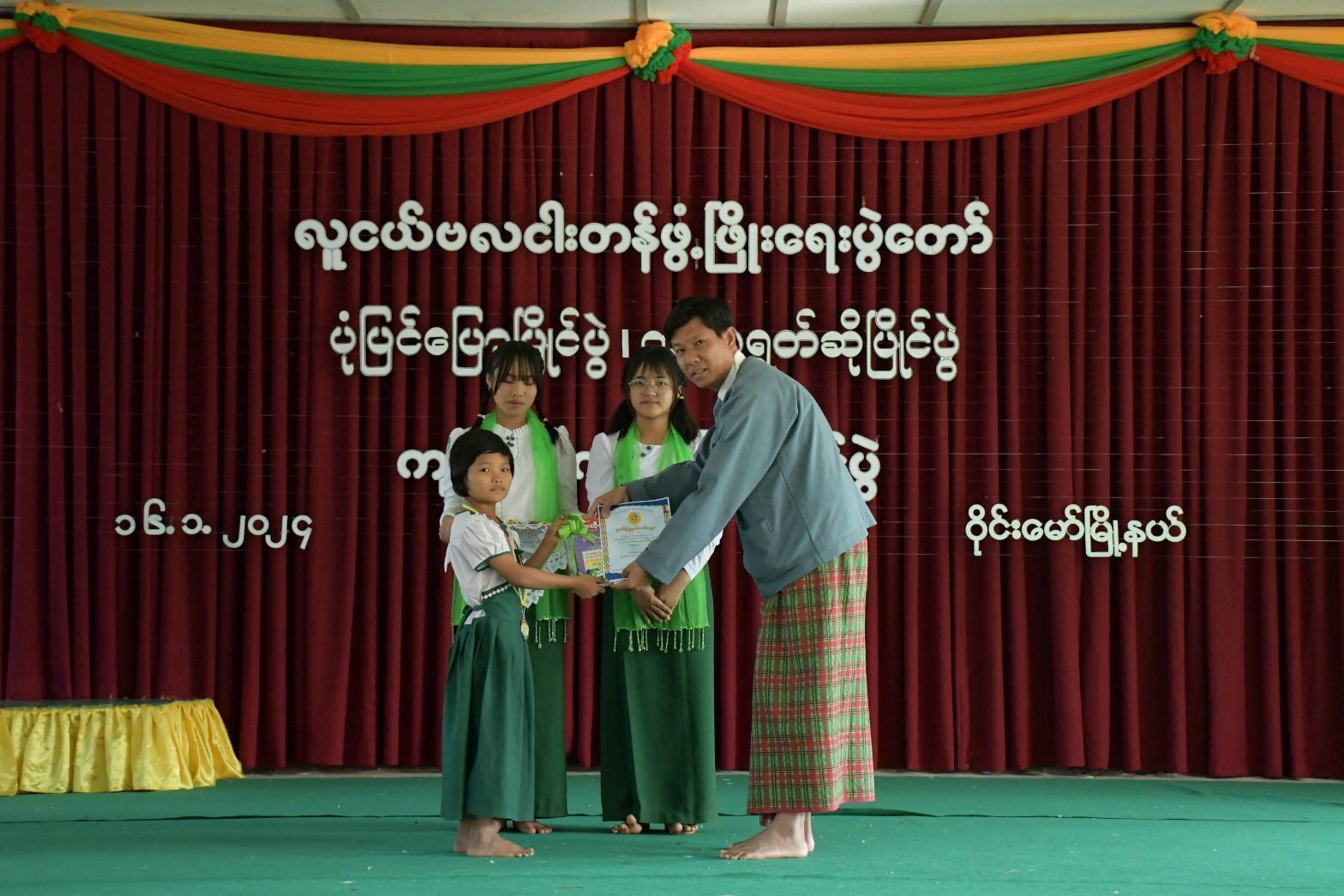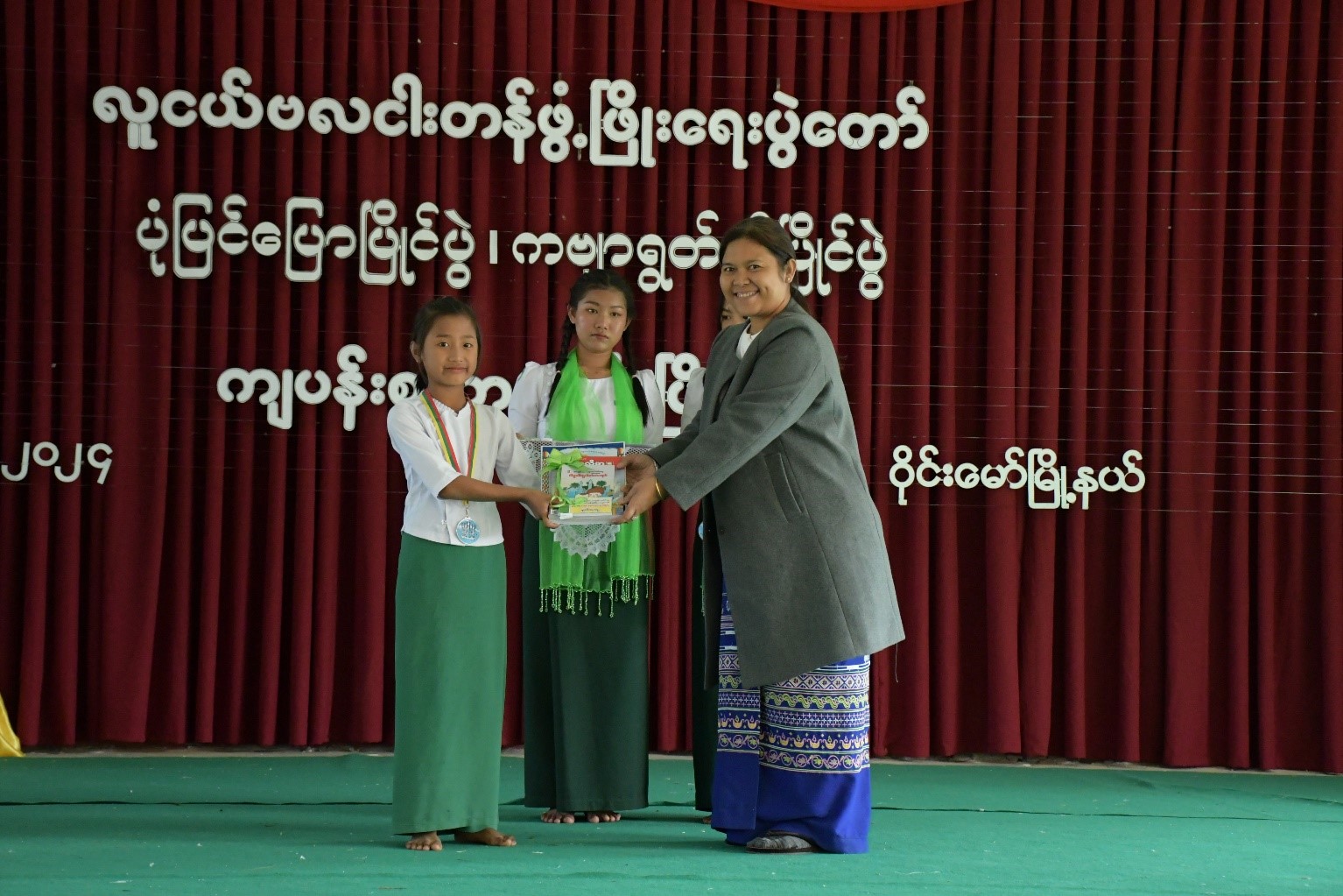 ယင်းနောက် ဆုများရရှိခဲ့ကြသော ပြိုင်ပွဲဝင်ကျောင်းသား၊ ကျောင်းသူများအား မြို့နယ်စီမံ အုပ်ချုပ်ရေးကောင်စီအဖွဲ့ဝင် ဦးကြည်ထွန်း၊ တိုင်းရင်းသားစာပေနှင့်ယဉ် ကျေးမှုဦးစီးဌာနမှ ပြည်နယ် တာဝန်ခံ ဒေါ်အိအိအေး၊ ဦးစီးအရာရှိများဖြစ်ကြသည့် ဦးခင်မောင်ထွန်းနှင့် ဦးလှိုင်ဝင်းဟန်၊ အထက(၂) ကျောင်းအုပ်ဆရာမကြီး ဒေါ်မိုးမိုးကြည်၊ ကချင်ပြည်နယ်စာကြည့်တိုက်များဖောင်ဒေးရှင်း ဥက္ကဋ္ဌ၊ စာရေးဆရာ အကြီးကိုကို(ကသာ)နှင့် တာဝန်ရှိသူများက ဆုများ အသီးသီးချီးမြှင့်ပေးအပ်ကြသည်။