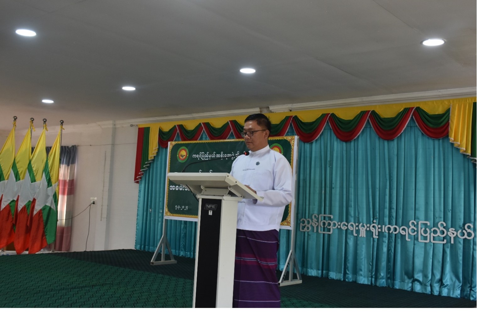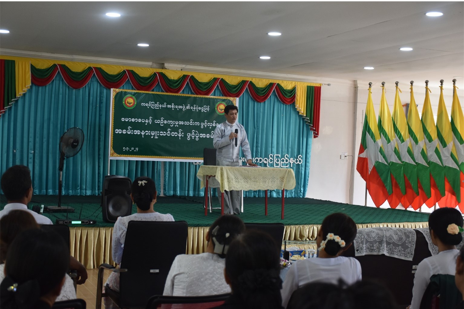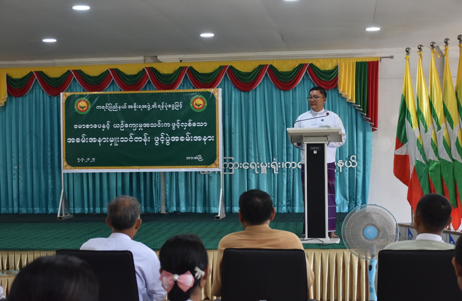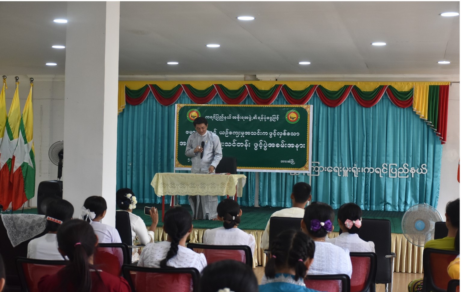 ကရင်ပြည်နယ်အစိုးရအဖွဲ့၊ တိုင်းရင်းသားရေးရာဝန်ကြီးဦးဆောင်မှုဖြင့် တိုင်းရင်းသားစာပေနှင့် ယဉ်ကျေးမှုဦးစီးဌာနနှင့် ဗမာတိုင်းရင်းသားလူမျိုးရေးရာအသင်းတို့ ပူးပေါင်းပြီး အခမ်းအနားမှူးသင်တန်း သင်တန်းဖွင့်ပွဲအခမ်းအနားကို မတ်လ(၅)ရက်နေ့က တိုင်းရင်းသားလူမျိုးများရေးရာဝန်ကြီးဌာန၊ ကရင်ပြည်နယ်၊ ညွှန်ကြားရေးမှူးရုံး၊ အစည်းအဝေးခန်းမတွင် ကျင်းပပြုလုပ်ခဲ့ပါသည်။