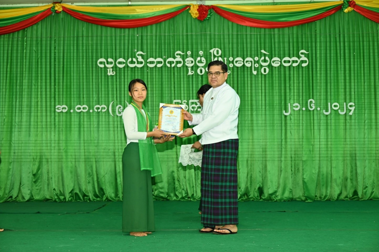ထို့နောက် ကချင်ပြည်နယ် စာကြည့်တိုက်များဖောင်ဒေးရှင်းဥက္ကဋ္ဌ စာရေးဆရာ အကြီးကိုကို (ကသာ)က လူငယ်ဘက်စုံဖွံ့ဖြိုးရေးပွဲတော် ကျင်းပရခြင်း၏ ရည်ရွယ်ချက်များကို ရှင်းလင်းတင်ပြပြီး ပြည်နယ်ဝန်ကြီးချုပ်က လူငယ်ဘက်စုံဖွံ့ဖြိုးရေးပွဲတော် အထိမ်းအမှတ်အထက်တန်းအဆင့် စာစီစာကုံး ပြိုင်ပွဲတွင် ဆုရရှိသူများအား ဂုဏ်ပြုဆုတံဆိပ်၊ ဂုဏ်ပြုချီးမြှင့်ငွေနှင့် ဂုဏ်ပြုမှတ်တမ်းလွှာ များကိုလည်းကောင်း၊ ပြည်နယ်လူမှုရေးရာဝန်ကြီးက ပွဲတော်တွင် ပါဝင်ကူညီခဲ့ကြသော အကအဖွဲ့များ နှင့် ဘင်ခရာအဖွဲ့တို့အတွက် ဂုဏ်ပြုချီးမြှင့်ငွေများကိုလည်းကောင်း အသီးသီး ချီးမြှင့်ခဲ့ကြကာ Grade-4 ကျောင်းသူလေးများ၏ အကအလှများဖြင့် ဖျော်ဖြေတင်ဆက်မှုကိုလည်း ကြည့်ရှုအားပေးခဲ့ကြပါသည်။