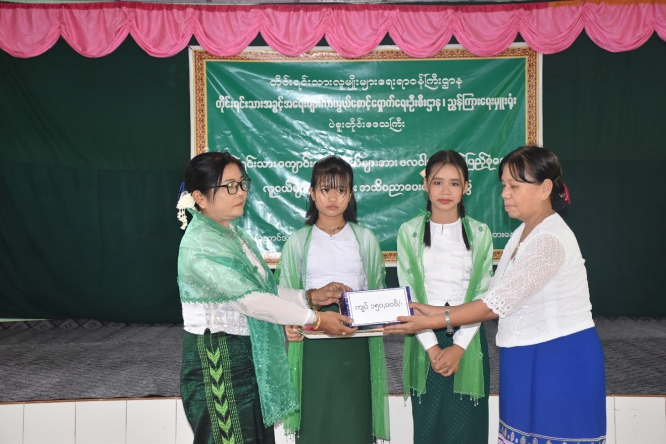 ဆက်လက်၍ တိုင်းရင်းသားရေးရာဝန်ကြီး ဦးစောလင်းအောင်က ဟောပြောပို့ချပေးသော ဌာနဆိုင်ရာများမှ တာဝန်ရှိသူများအား အမှတ်တရလက်ဆောင်များ ပေးအပ်ခဲ့ပြီး တိုင်းရင်းသား အခွင့်အရေးများကာကွယ်စောင့်ရှောက်ရေးဦးစီးဌာန၊ ပဲခူးတိုင်းဒေသကြီး ညွှန်ကြားရေးမှူးရုံးမှ ညွှန်ကြားရေးမှူး ဒေါ်ခိုင်ရွှေဝါက ကျောင်းစာကြည့်တိုက်အတွက် အလှူငွေ ကျပ်တစ်သိန်းငါးသောင်းတိတိအား အ.လ.က(ညောင်အင်း) ကျောင်းအုပ်ဆရာမကြီးထံ ပေးအပ်လှူဒါန်းခဲ့ပါသည်။
