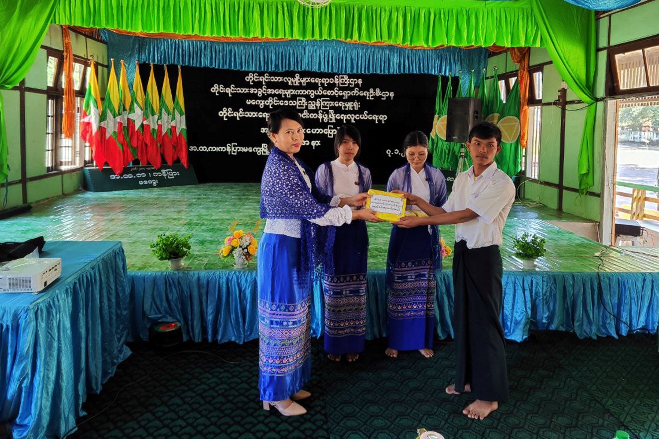 ထို့နောက် တက်ရောက်လာကြသည့် ကျောင်းသား၊ ကျောင်းသူများအား အသိပညာပေး ဟောပြောသည့် အကြောင်းအရာများနှင့်စပ်လျဉ်းသည့် ဉာဏ်စမ်းမေးခွန်းများအား မေးမြန်းခဲ့ပြီး ဖြေဆိုနိုင်သည့် ကျောင်းသား/သူများအား ဆုလက်ဆောင်များချီးမြှင့်ခြင်း၊ ကန်ပြားကျေးရွာ အထက်တန်းကျောင်းစာကြည့်တိုက်အတွက် တိုင်းရင်းသားလူမျိုးများ၏ အခွင့်အရေးကာကွယ် စောင့်ရှောက်သည့် ဥပဒေ၊ နည်းဥပဒေစာအုပ်များ၊ ကလေးအလုပ်သမားပပျောက်ရေးဆိုင်ရာ ဥပဒေစာအုပ်များပေးအပ်ခြင်း၊ အားကစားနှင့်ကာယပညာဦးစီးဌာနမှ စာသင်ကျောင်းအတွက် ဘောလုံး၊ ခြင်းလုံးစသည့် အားကစားပစ္စည်းများပေးအပ်ခြင်း၊ လမ်းပန်းဆက်သွယ်ရေးဝန်ကြီးမှ စာသင်ကျောင်းအတွက် အလှူငွေထောက်ပံ့ပေးအပ်ခြင်းတို့ကို ဆောင်ရွက်ခဲ့ကြောင်း သိရှိရပါ သည်။