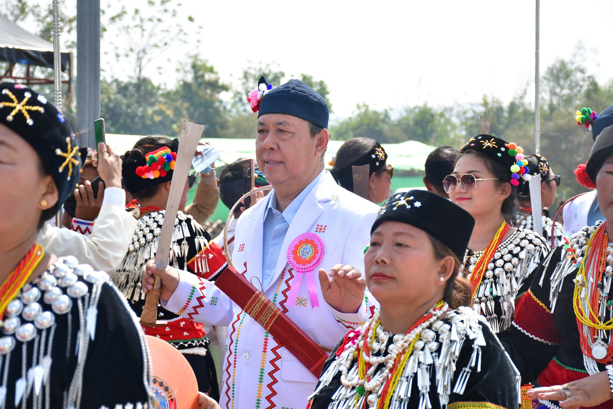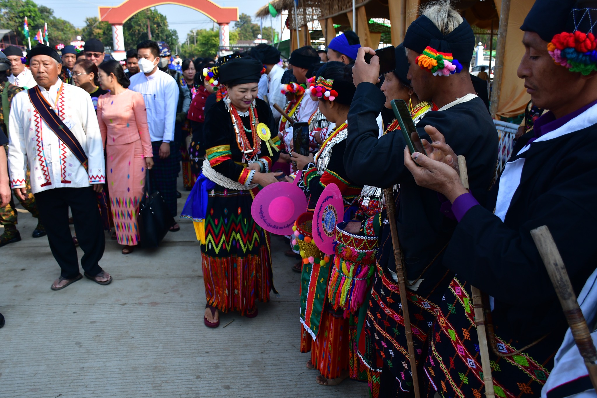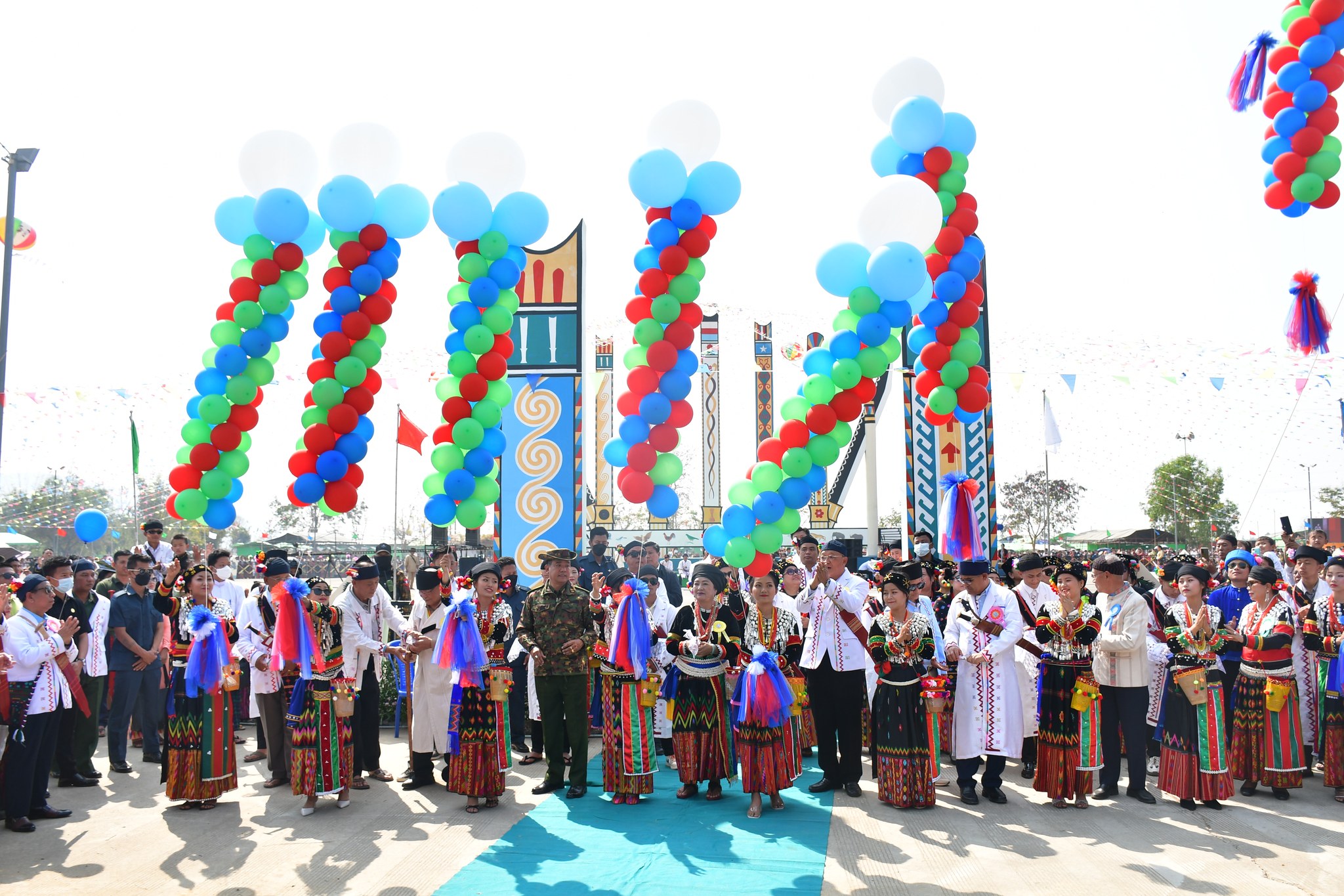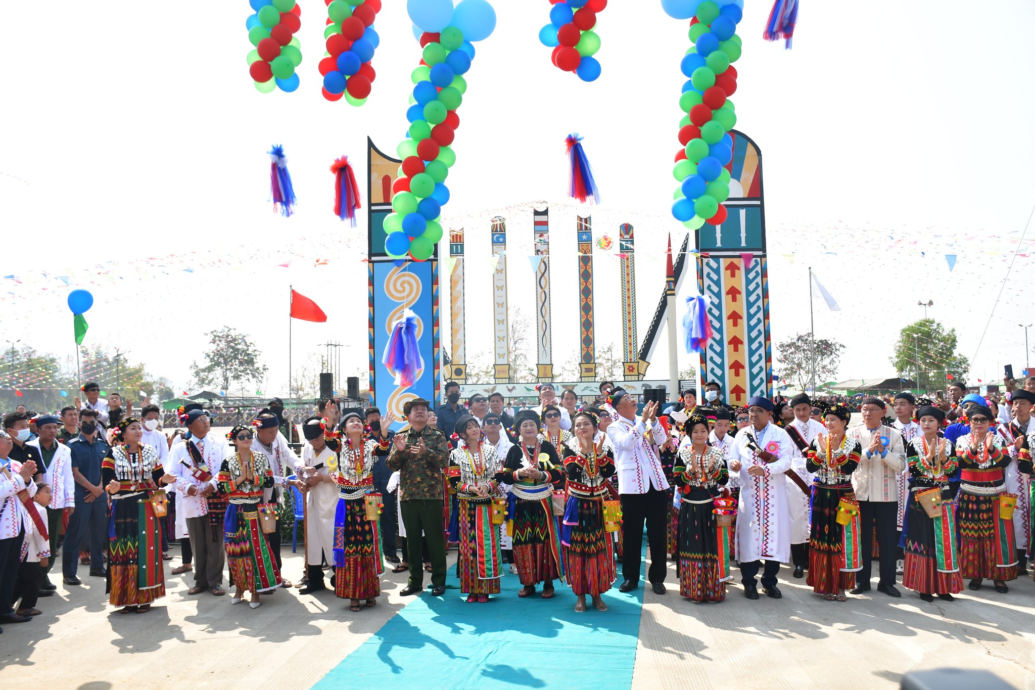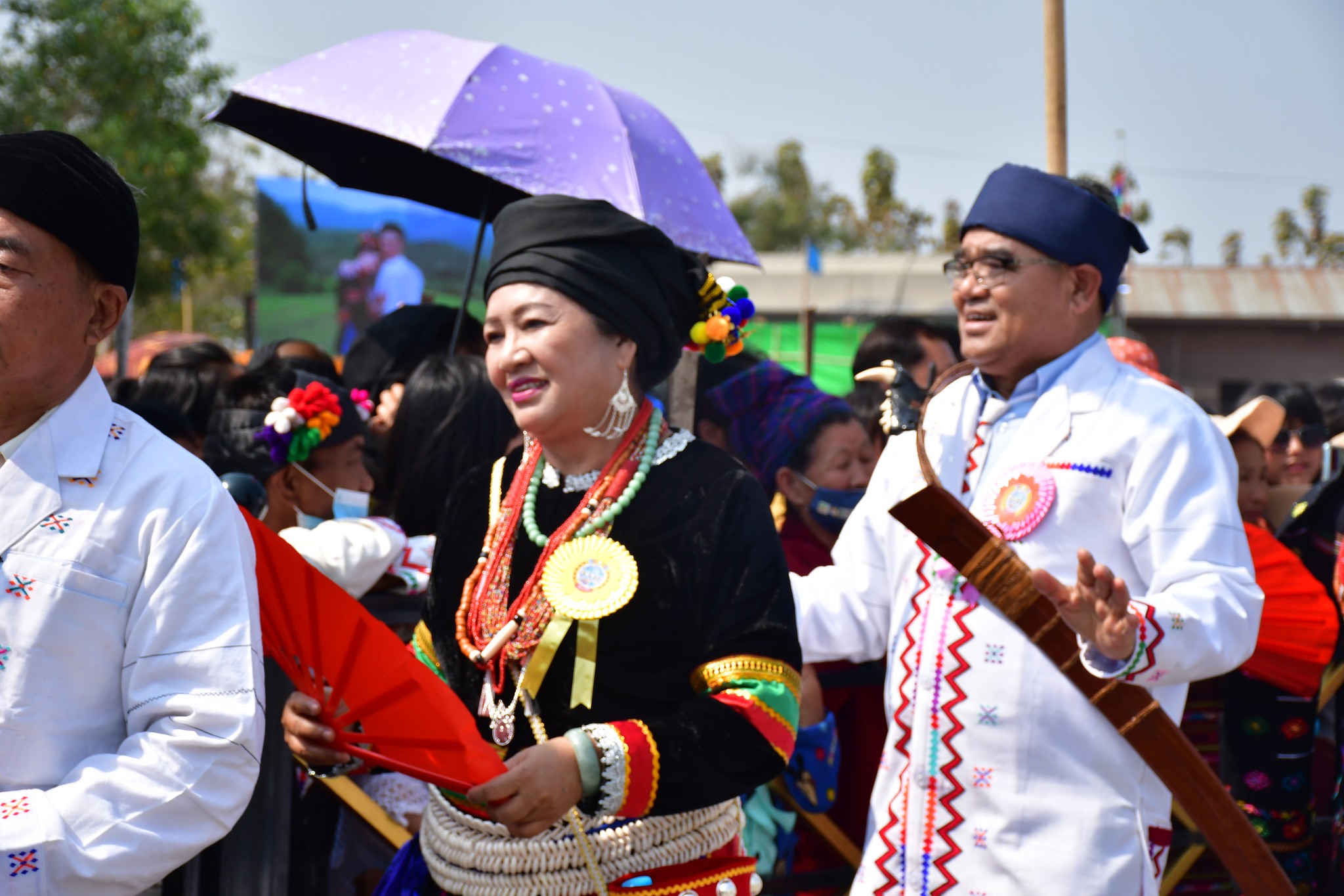 နိုင်ငံတော်စီမံအုပ်ချုပ်ရေးကောင်စီအဖွဲ့ဝင် ဒေါ်ဒွဲဘူနှင့် ပြည်ထောင်စုဝန်ကြီး Jeng Phang နော်တောင် လာချိဒ် တိုင်းရင်းသားရိုးရာ မုဒ်ဦး၊ ရိုးရာအိမ်တော်၊ မနောကွင်းဖွင့်ပွဲနှင့် ကျုံးဇွမ်မနောပွဲတော် အခမ်းအနားသို့ တက်ရောက် ဝိုင်းမော် မတ် (၃)