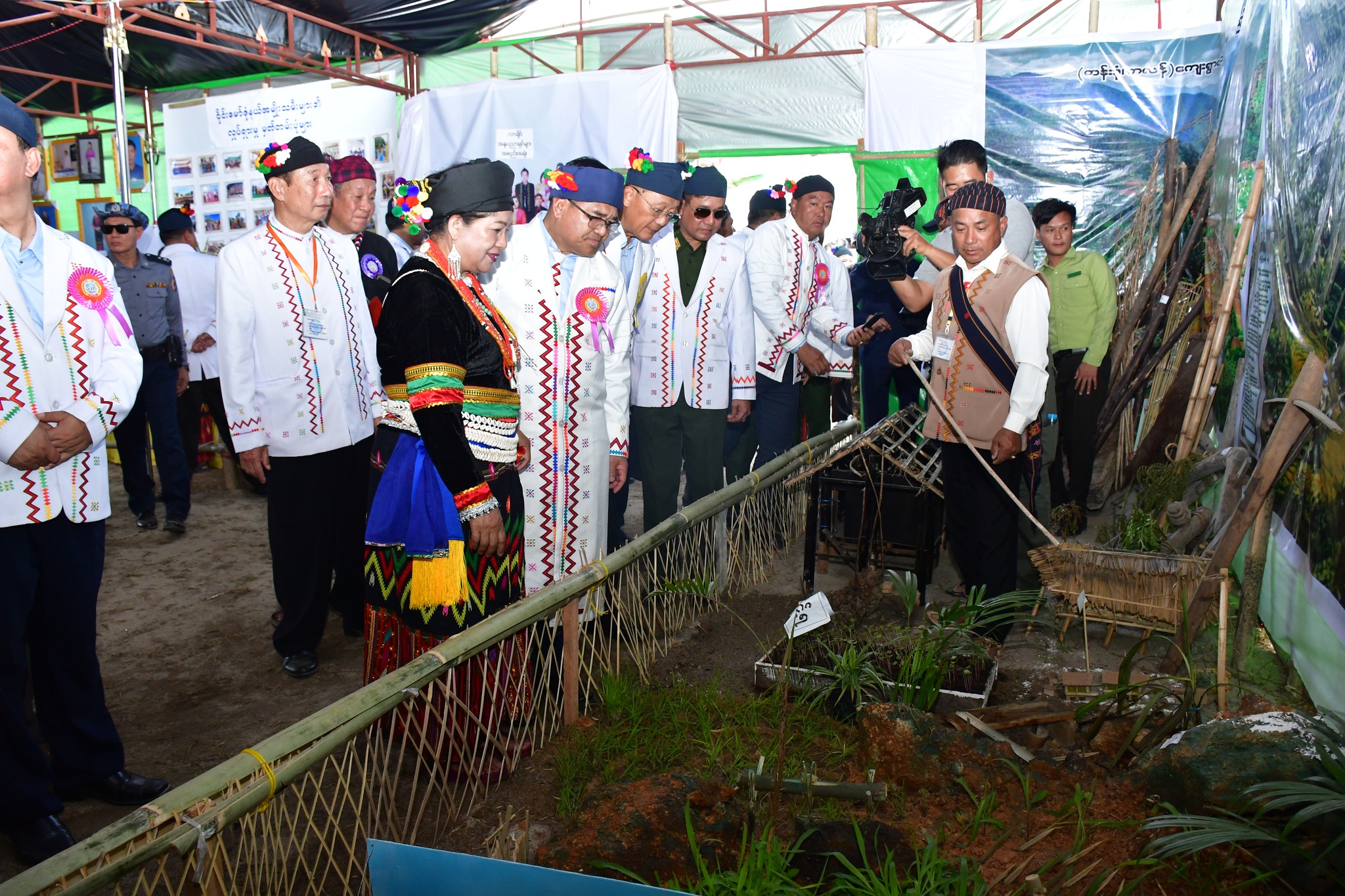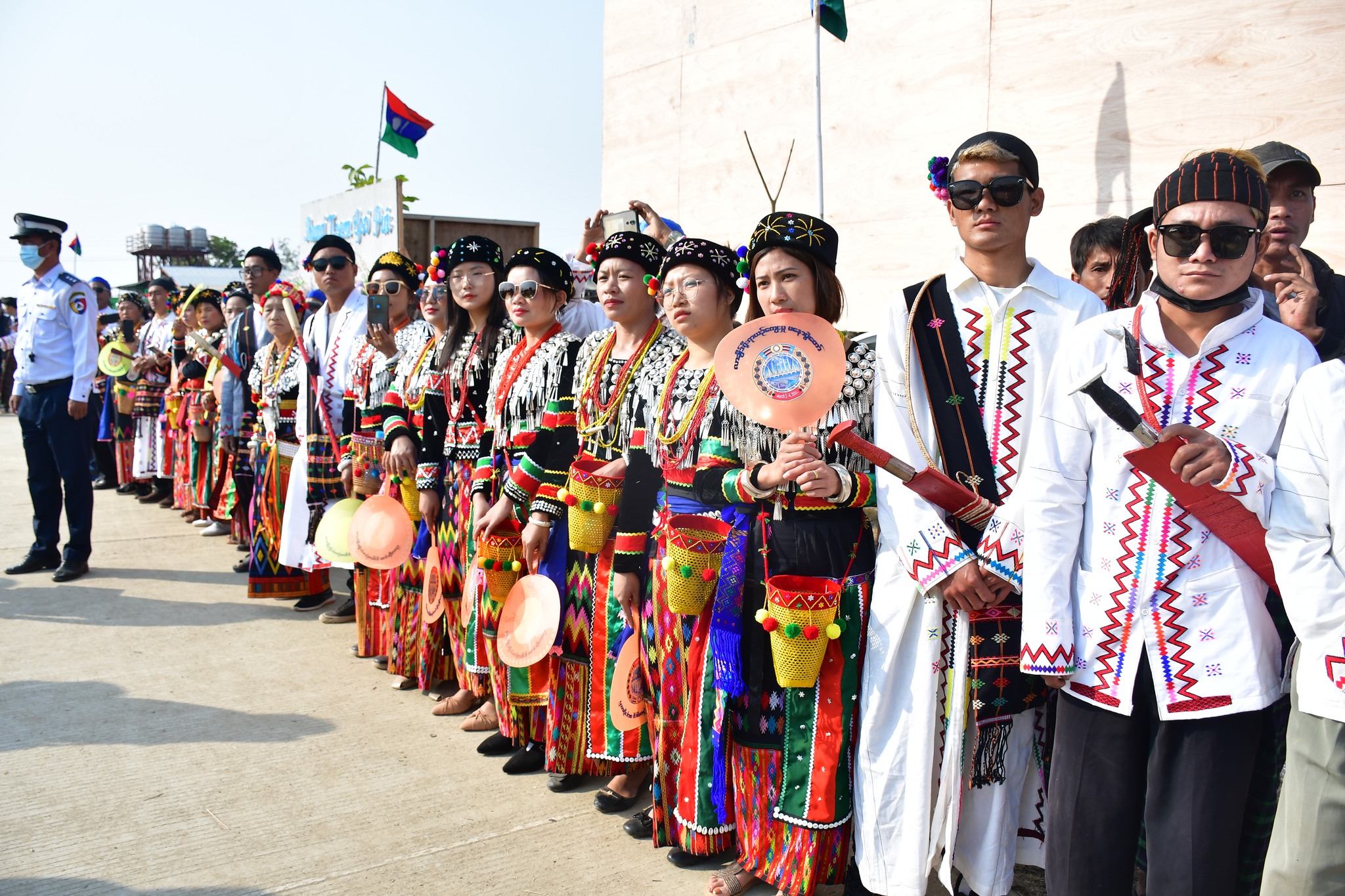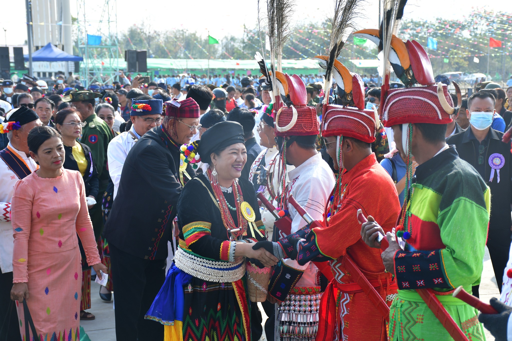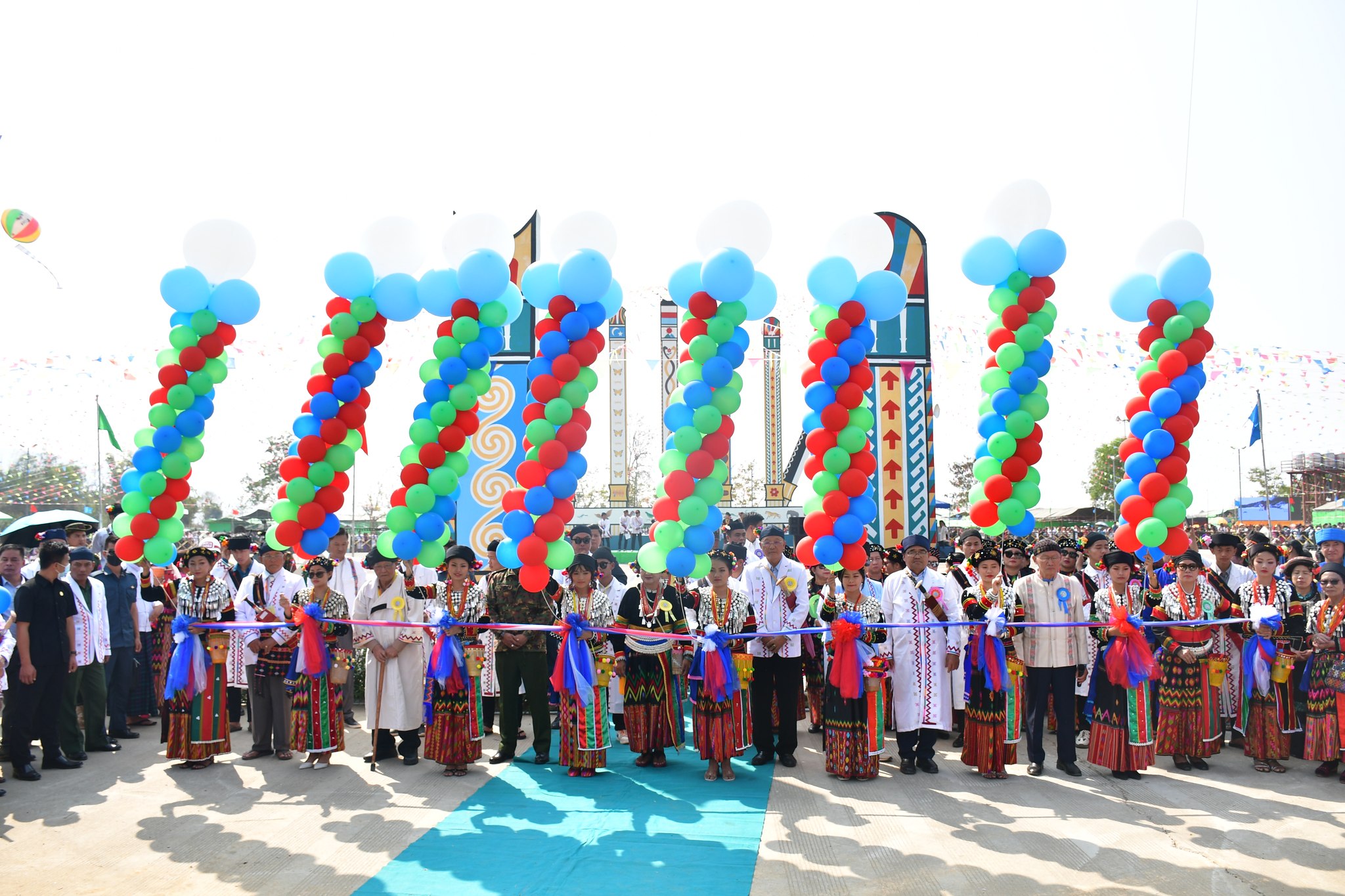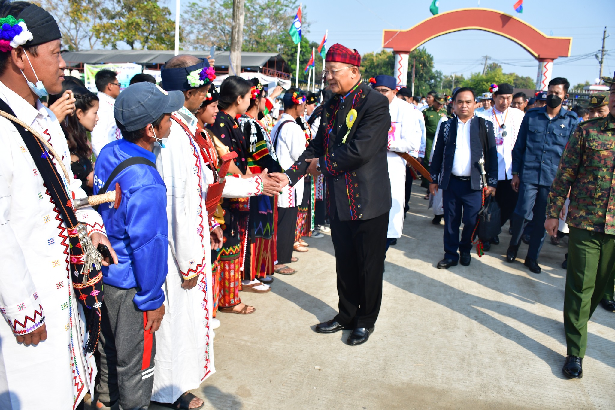 နိုင်ငံတော်စီမံအုပ်ချုပ်ရေးကောင်စီအဖွဲ့ဝင် ဒေါ်ဒွဲဘူနှင့် ပြည်ထောင်စုဝန်ကြီး Jeng Phang နော်တောင် လာချိဒ် တိုင်းရင်းသားရိုးရာ မုဒ်ဦး၊ ရိုးရာအိမ်တော်၊ မနောကွင်းဖွင့်ပွဲနှင့် ကျုံးဇွမ်မနောပွဲတော် အခမ်းအနားသို့ တက်ရောက် ဝိုင်းမော် မတ် (၃)