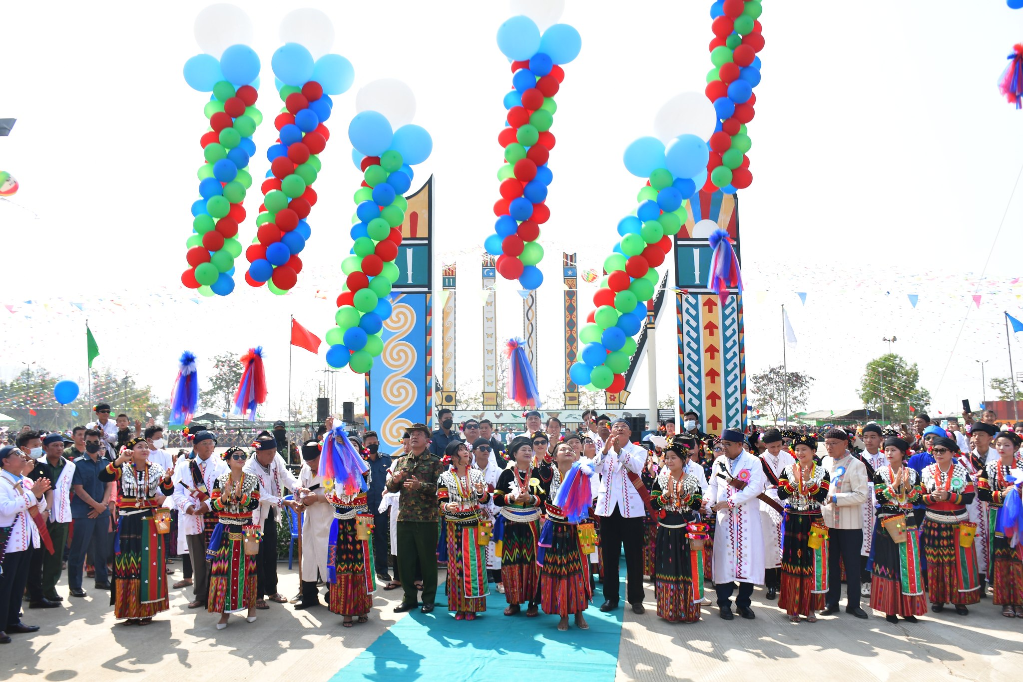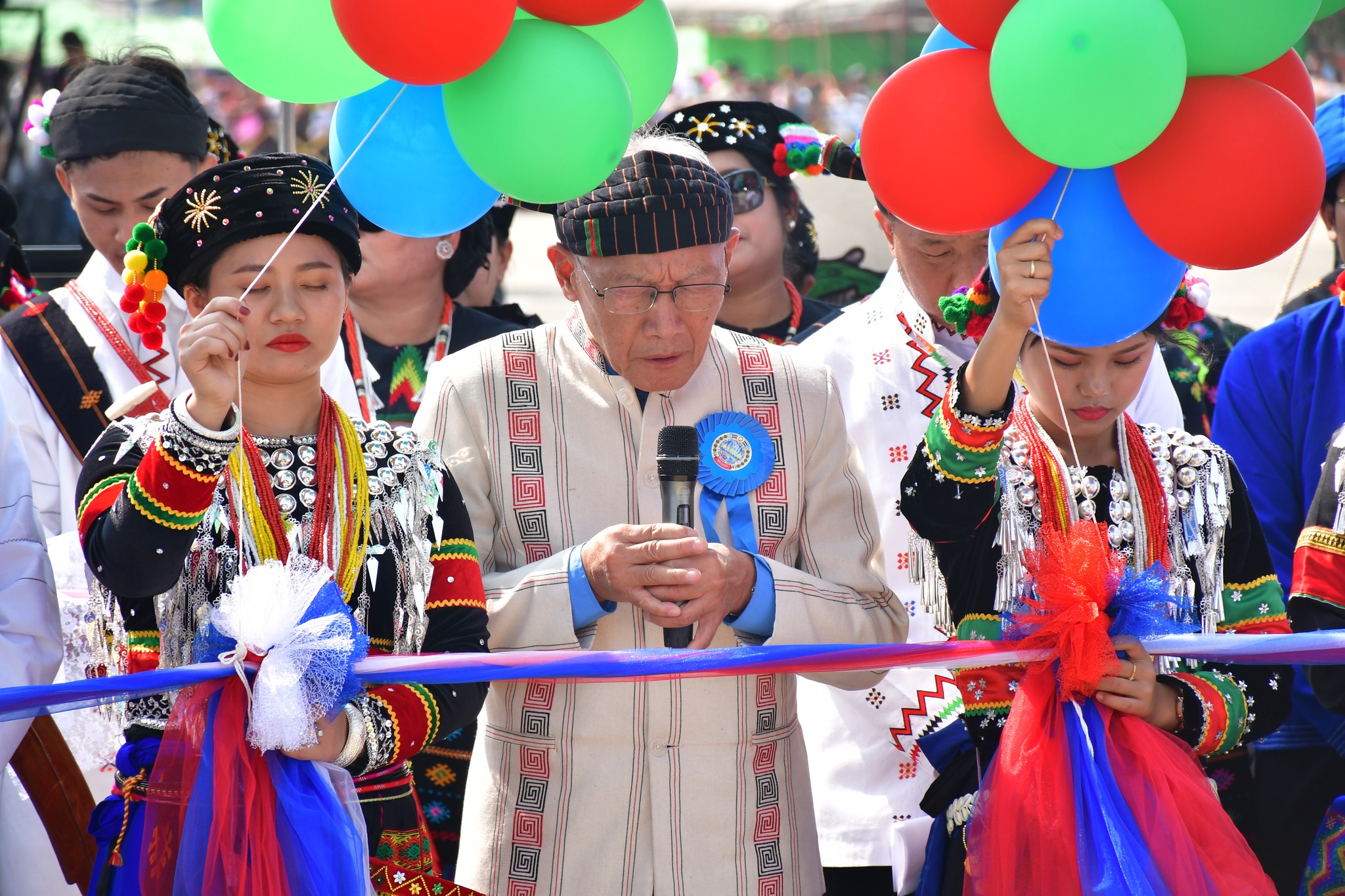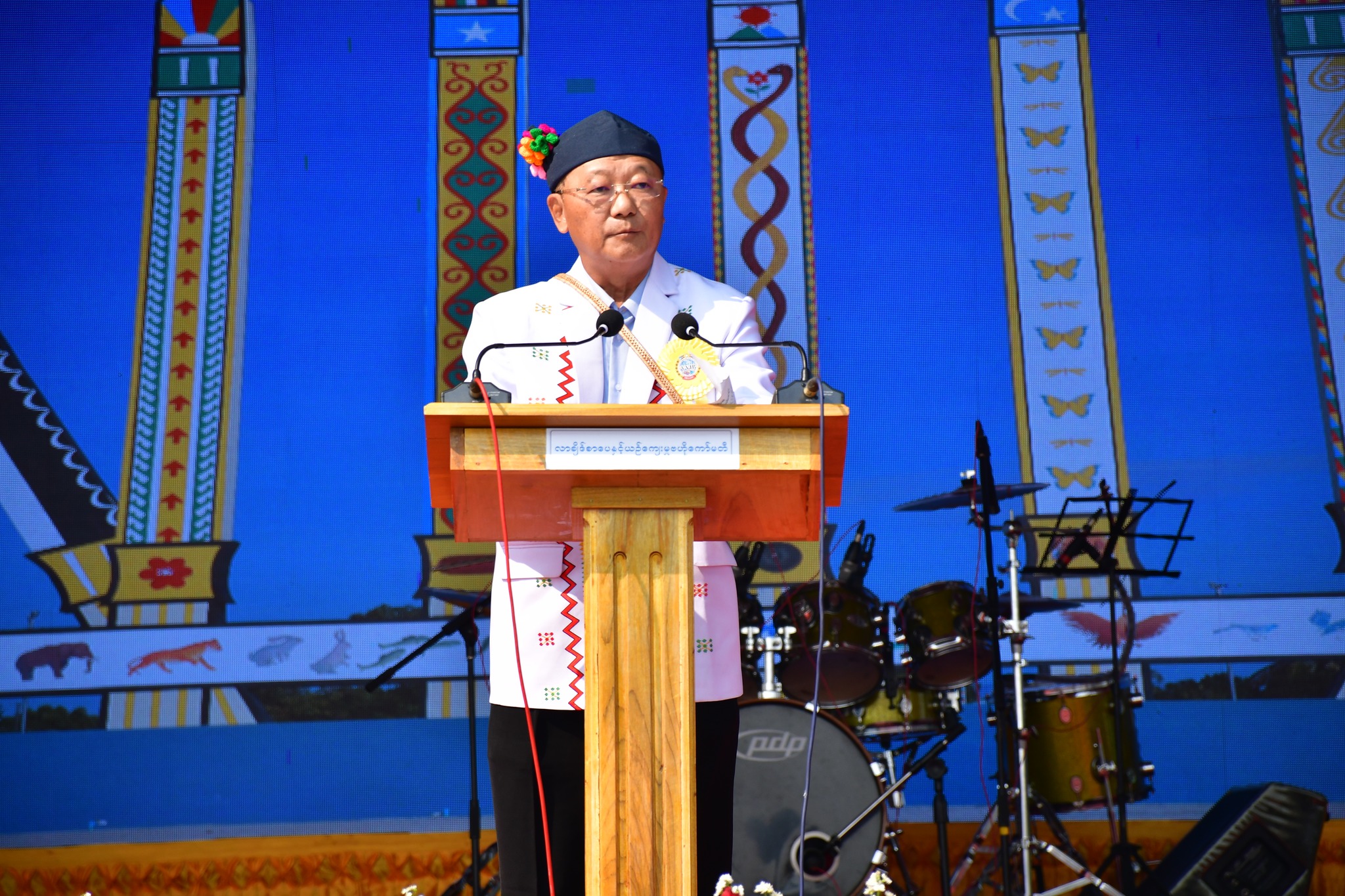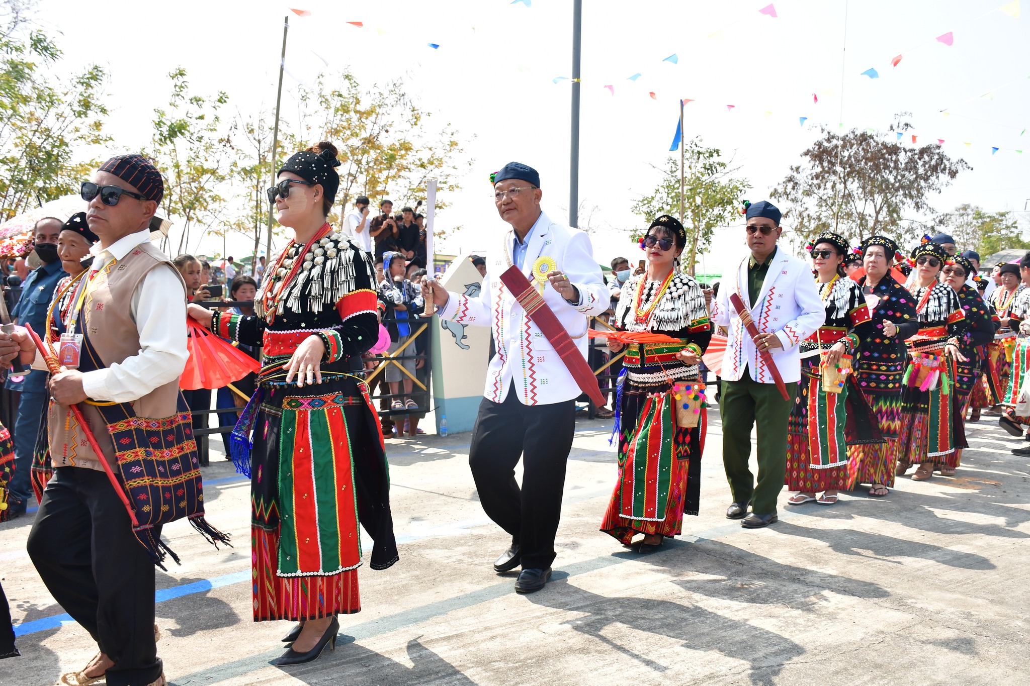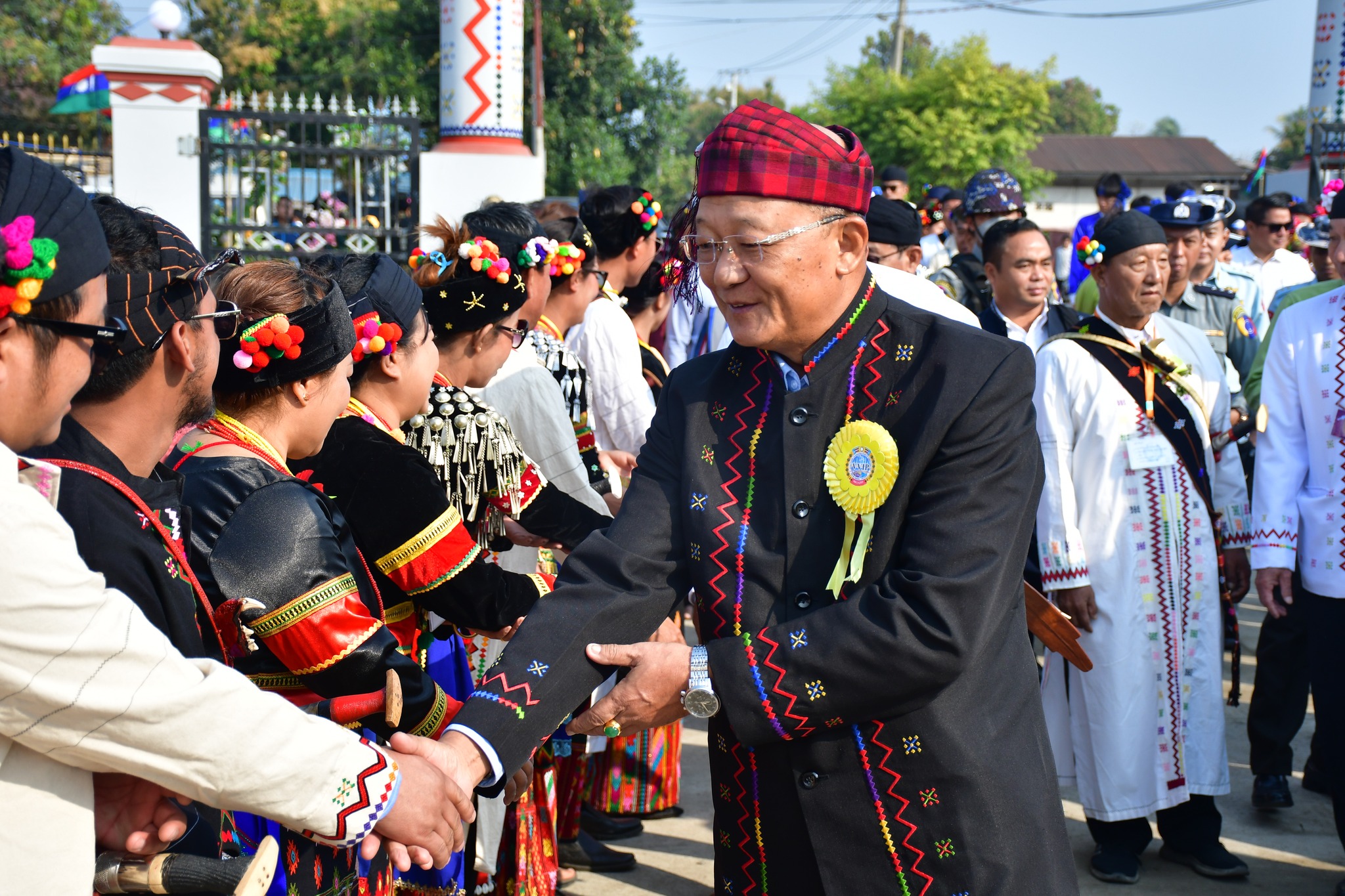 နိုင်ငံတော်စီမံအုပ်ချုပ်ရေးကောင်စီအဖွဲ့ဝင် ဒေါ်ဒွဲဘူနှင့် ပြည်ထောင်စုဝန်ကြီး Jeng Phang နော်တောင် လာချိဒ် တိုင်းရင်းသားရိုးရာ မုဒ်ဦး၊ ရိုးရာအိမ်တော်၊ မနောကွင်းဖွင့်ပွဲနှင့် ကျုံးဇွမ်မနောပွဲတော် အခမ်းအနားသို့ တက်ရောက် ဝိုင်းမော် မတ် (၃)