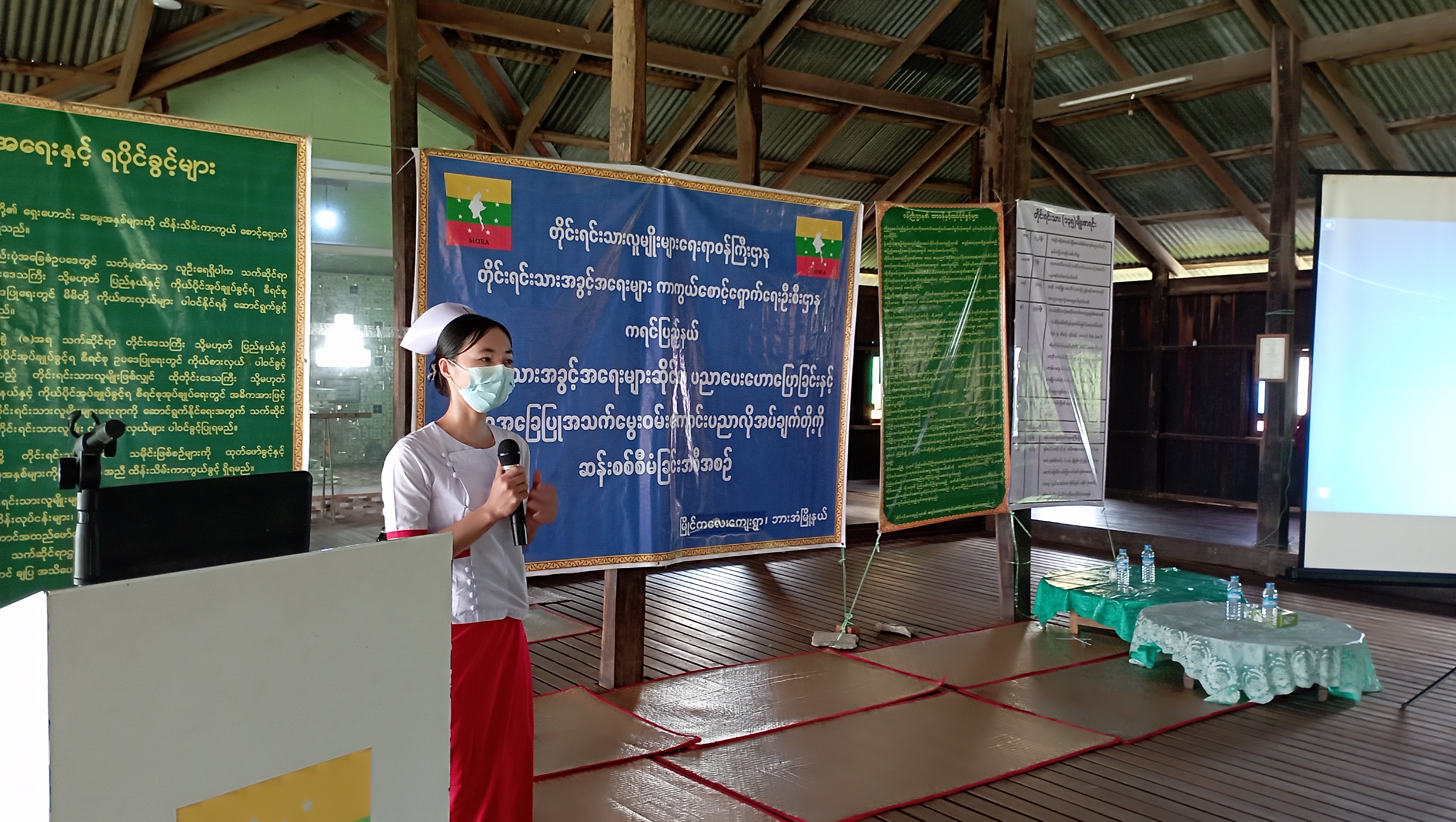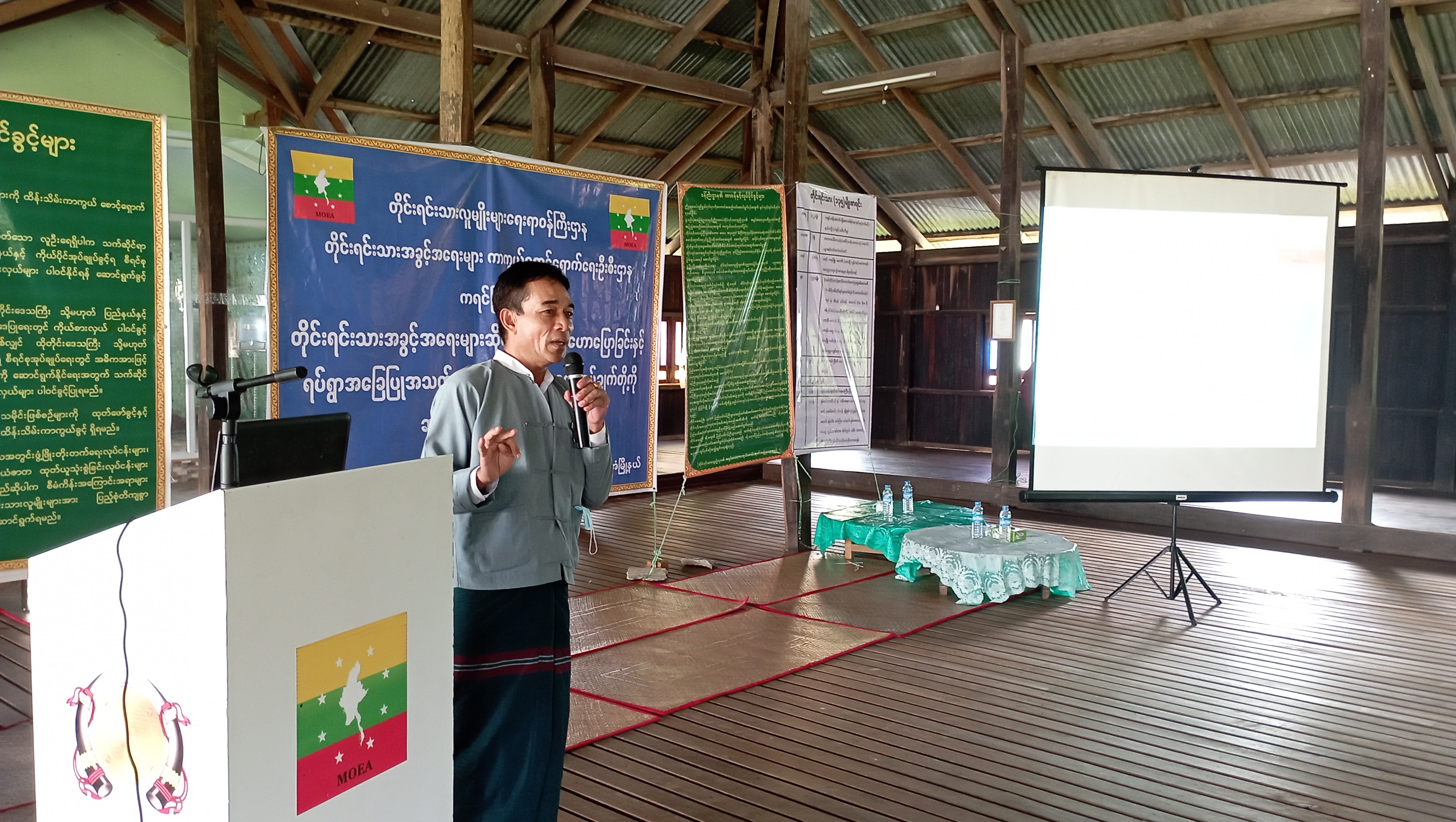 ဆက်လက်၍ တိုင်းရင်းသားအခွင့်အရေးများကာကွယ်စောင့်ရှောက်ရေးဦးစီးဌာန၊ ကရင် ပြည်နယ်၊ ညွှန်ကြားရေးမှူးရုံးမှ အငယ်တန်းစာရေး ဦးအောင်ဖြိုးသော်က အမုန်းစကားနှင့် အကြမ်းဖက်လှုံ့ဆော်မှုကို တားဆီးခြင်းဆိုင်ရာ အသိပညာပေးကိစ္စရပ်များနှင့် ရပ်ရွာအခြေပြု အသက်မွေးဝမ်းကျောင်းပညာလိုအပ်ချက်တို့ကို ဆန်းစစ်စီမံခြင်း စစ်တမ်းကောက်ယူရခြင်း ရည်ရွယ်ချက်နှင့် စစ်တမ်းဖြေဆိုပုံ မေးခွန်းများကို ရှင်းလင်းပြောကြားခဲ့ပါသည်။
