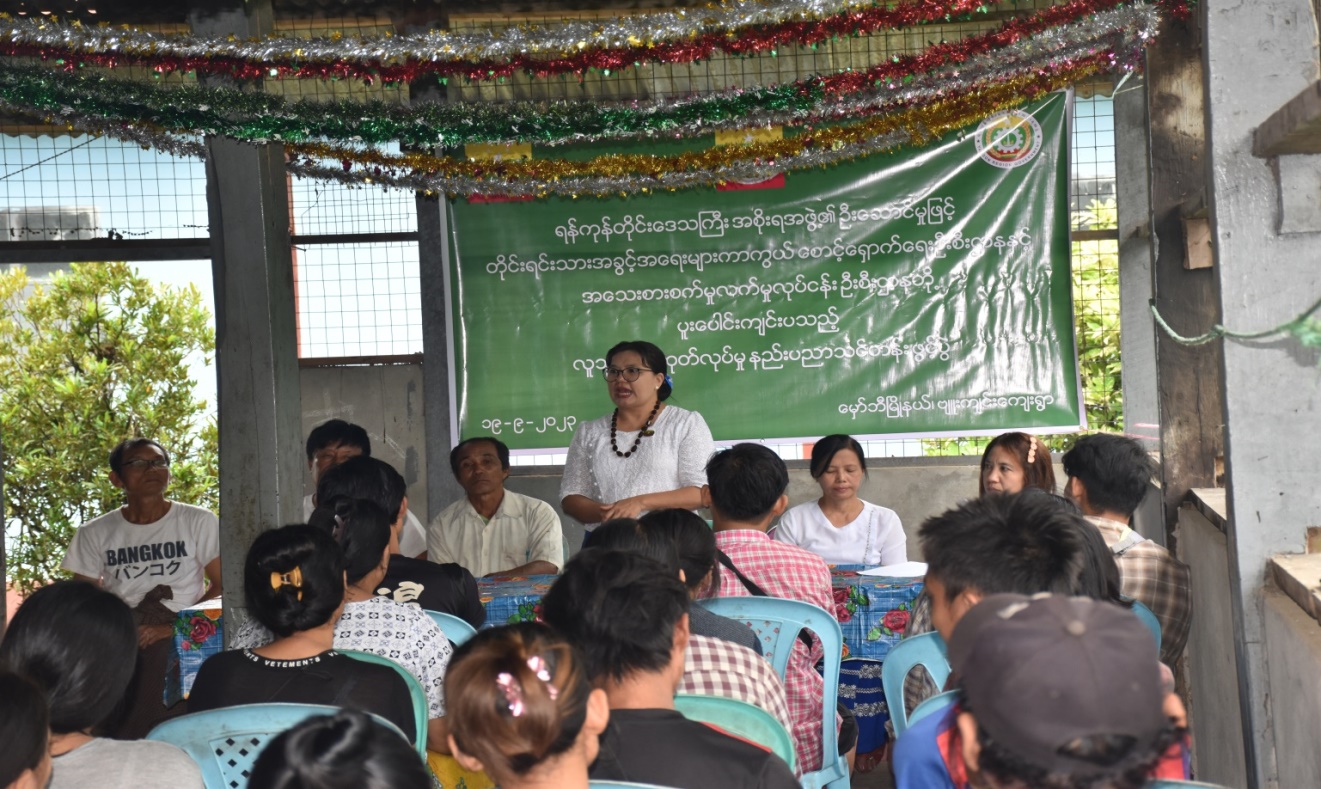 ပထမဦးစွာ တိုင်းရင်းသားအခွင့်အရေးများကာကွယ်စောင့်ရှောက်ရေးဦးစီးဌာန၊ ရန်ကုန် တိုင်းဒေသကြီးညွှန်ကြားရေးမှူးရုံးမှ ဒုတိယညွှန်ကြားရေးမှူး ဒေါ်ဖြူဖြူဝင်းက တိုင်းရင်းသား လူမျိုးများရေးရာဝန်ကြီးဌာနအကြောင်းမိတ်ဆက်ခြင်း၊ တိုင်းရင်းသားလူမျိုးများ၏ အခွင့်အရေး ကာကွယ်စောင့်ရှောက်သည့်ဥပဒေ၊ နည်း ဥပဒေများအကြောင်းတို့ကိုလည်းကောင်း၊ တိုင်းရင်းသား အချင်းချင်း အမုန်းစကားနှင့် အကြမ်းဖက်မှုဖြစ်စေရန် လှုံ့ဆော်မှုကို တားဆီးရေးဆိုင်ရာ သိကောင်းစရာများကိုလည်းကောင်း၊ လူသုံးကုန်ထုတ်လုပ်မှုနည်းပညာသင်တန်း ဖွင့်လှစ်ပေး ရခြင်း ရည်ရွယ်ချက်များကိုလည်းကောင်း ရှင်းလင်းပြောကြားခဲ့ပါသည်။