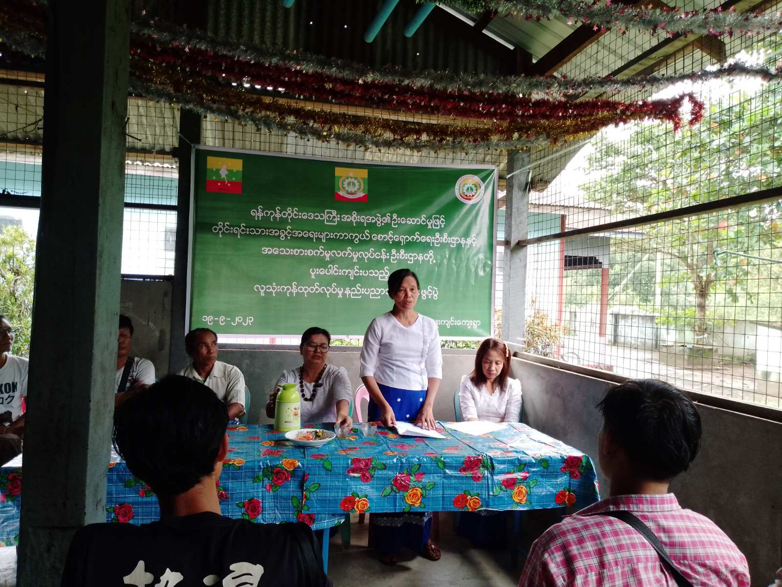 ဆက်လက်၍ အသေးစားစက်မှုလက်မှုလုပ်ငန်းဦးစီးဌာနမှ ဦးစီးအရာရှိ ဒေါ်ခင်စန်းထွေးက အသေးစားစက်မှုလက်မှုဦးစီးဌာန၏ သင်တန်းဖွင့်လှစ်ပေးနေမှုအခြေအနေနှင့် သင်တန်းဖွင့်လှစ် ရခြင်း၏ ရည်ရွယ်ချက်၊ သင်တန်းတွင် သင်ကြားပေးမည့်အကြောင်းအရာများနှင့် အမျိုးအစား တို့ကို ရှင်းလင်းပြောကြားခဲ့ပါသည်။ ထို့နောက် ရှင်းလင်းပြောကြားချက်များကို မှော်ဘီမြို့နယ်၊ ကရင်စာပေနှင့် ယဉ်ကျေးမှုအသင်း အတွင်းရေးမှူး ဦးစောဂျိုးဇက်မှ ကရင်ဘာသာစကားဖြင့် ပြန်လည်ပြောကြားခဲ့ပါသည်။