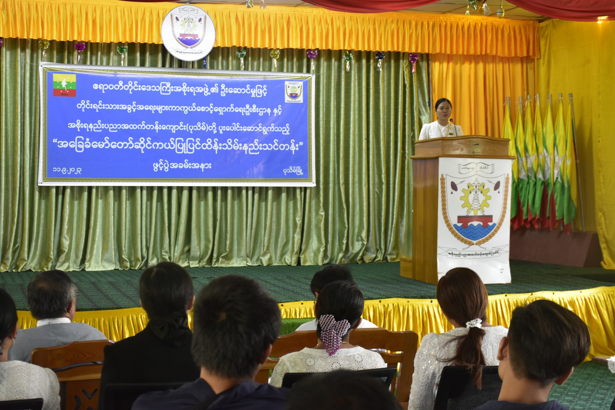 ဆက်လက်၍ တိုင်းရင်းသားအခွင့်အရေးများကာကွယ်စောင့်ရှောက်ရေးဦးစီးဌာန၊ ဧရာဝတီတိုင်း ဒေသကြီး ညွှန်ကြားရေးမှူးရုံးမှ ဒုတိယညွှန်ကြားရေးမှူး ဒေါ်စန်းက သင်တန်းဖွင့်လှစ်ရခြင်းရည်ရွယ်ချက်နှင့် သင်တန်းနှင့်ပတ်သက်သည့် အချက်များကို ရှင်းလင်းပြောကြားခဲ့ပါသည်။ ထို့နောက် တိုင်းရင်းသားရေးရာ ဝန်ကြီးနှင့် အခမ်း အနားသို့ တက်ရောက်လာကြသူများ၊ သင်တန်းနည်းပြဆရာ/ဆရာမများနှင့် သင်တန်း သားများ စုပေါင်း၍ မှတ်တမ်းတင်ဓါတ်ပုံ ရိုက်ကူးခဲ့ပါသည်။