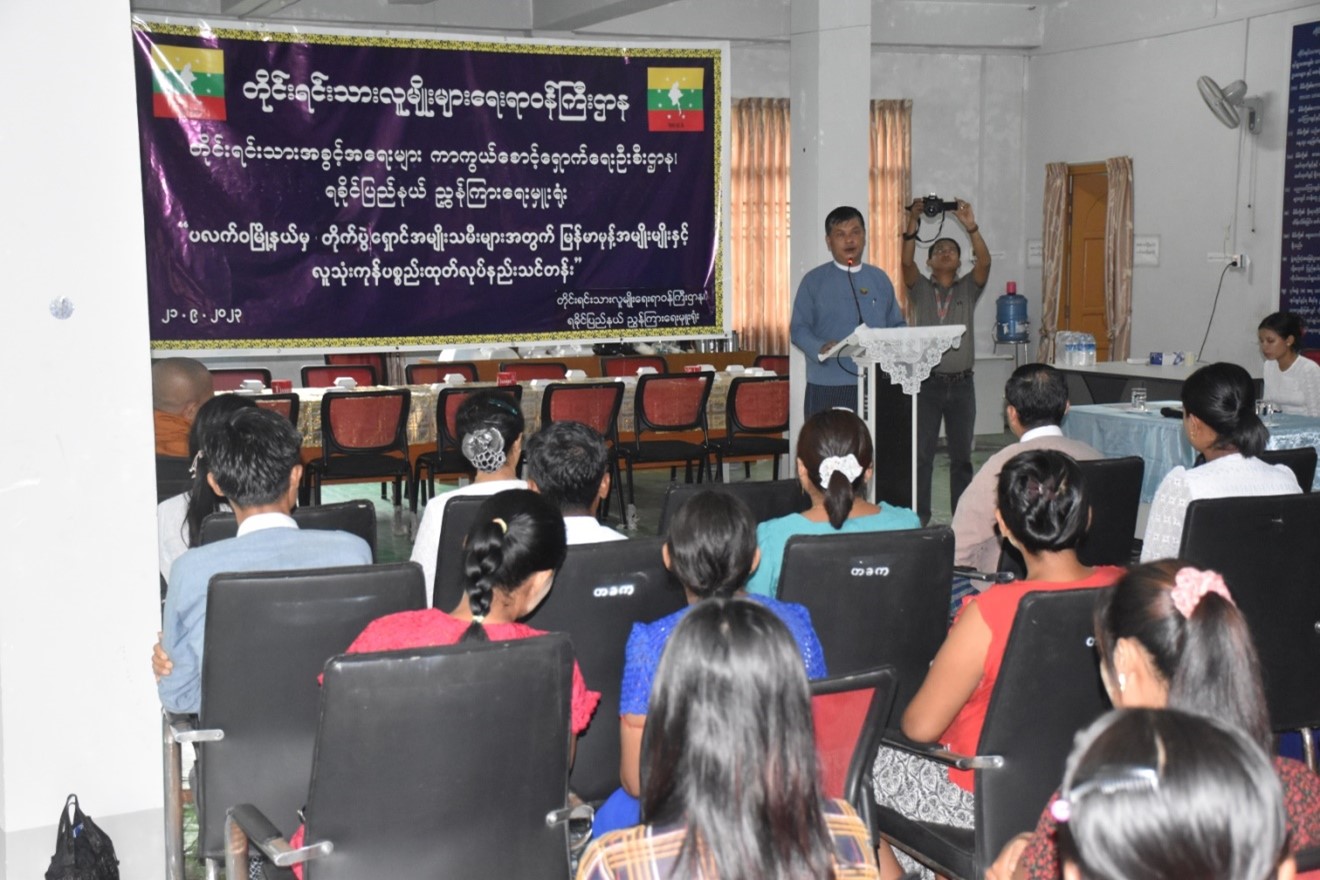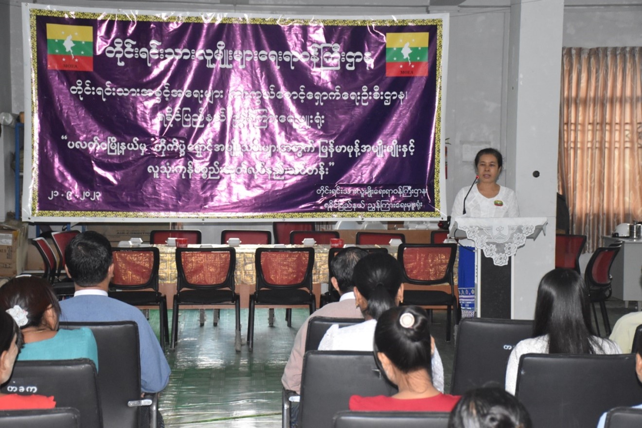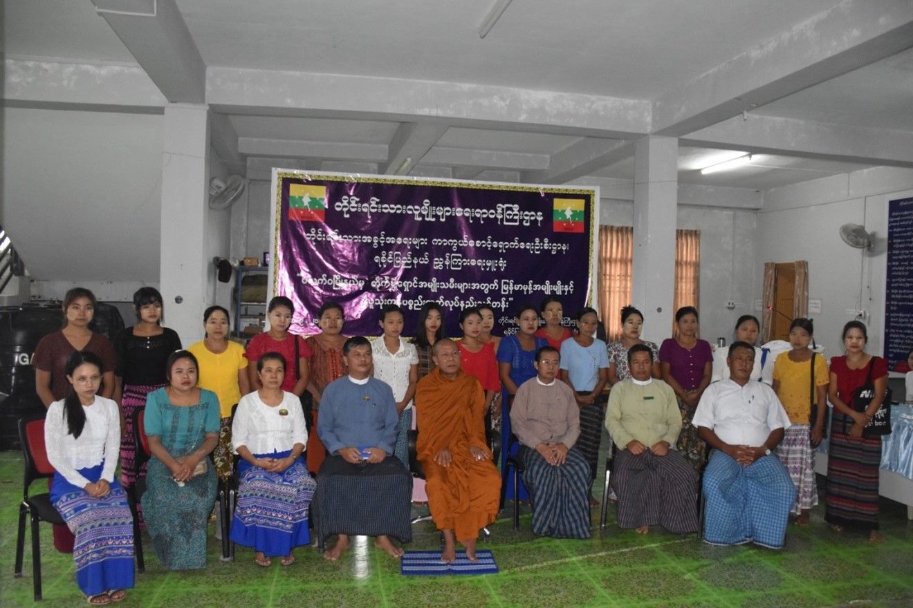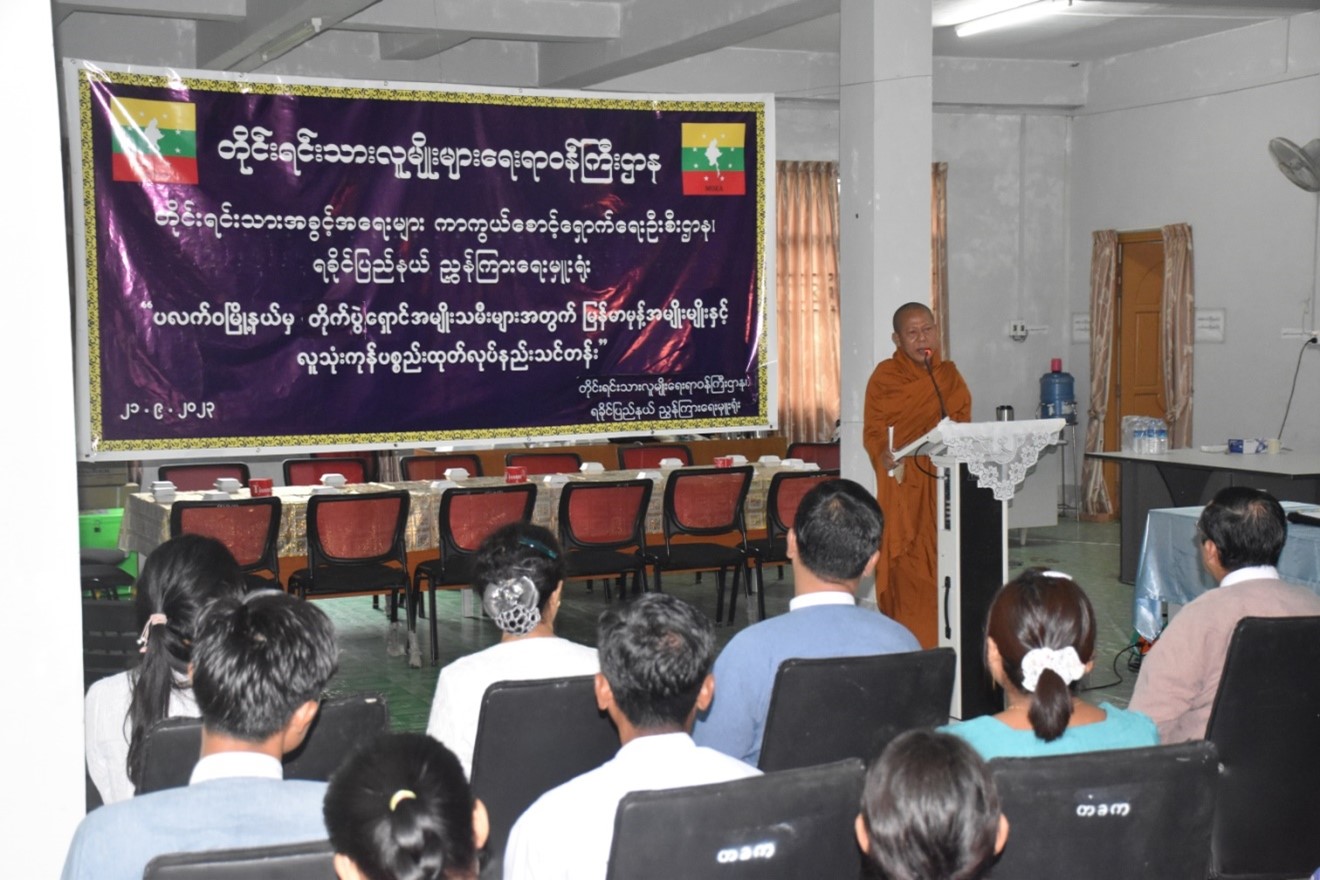 ရခိုင်ပြည်နယ် စစ်တွေမြို့၊ ဉဿလင်းဘုန်းတော်ကြီးကျောင်းတွင် ယာယီခိုလှုံနေသည့် ပလက်ဝမြို့နယ်မှ တိုက်ပွဲရှောင် အမျိုးသမီးများအတွက် တိုင်းရင်းသားလူမျိုးများရေးရာဝန်ကြီးဌာန၊ တိုင်းရင်းသားအခွင့်အရေးများကာကွယ်စောင့်ရှောက်ရေးဦးစီးဌာန၊ ရခိုင်ပြည်နယ်၊ ညွှန်ကြားရေးမှူး ရုံးက ဦးဆောင်၍ “ မြန်မာမုန့်အမျိုးမျိုးနှင့် လူသုံးကုန်ပစ္စည်းထုတ်လုပ်နည်းသင်တန်း”ဖွင့်ပွဲအခမ်းအနားကို (၂၁-၉-၂၀၂၃) ရက်နေ့နံနက်(၈:၃၀)နာရီအချိန်တွင် တိုင်းရင်းသားလူမျိုးများရေးရာ ဝန်ကြီးဌာန၊ ရခိုင်ပြည် နယ်၊ ညွှန်ကြားရေးမှူးရုံး၌ ကျင်းပခဲ့ပါသည်။