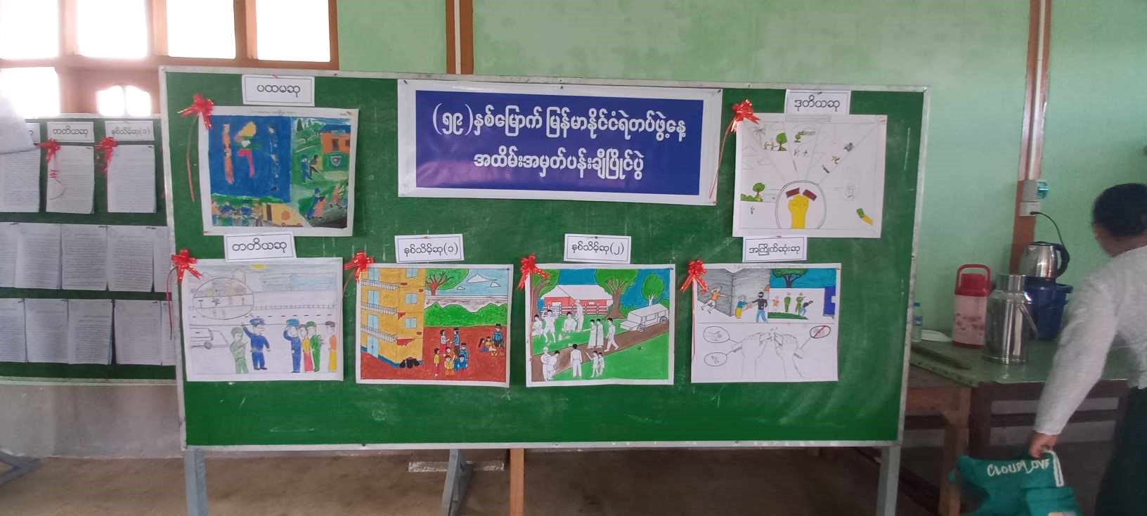 ယင်းနောက် စာစီစာကုံးနှင့် ပန်းချီပြိုင်ပွဲဝင်များ၌ ရေးသားပုံဖော်ထားသည့် လက်ရာများအား နံရံကပ်ပြဘုတ်တွင် ပြသထားရှိမှုများအား လေ့လာကြည့်ရှုခဲ့ကြကြောင်း သတင်းရရှိပါသည်။